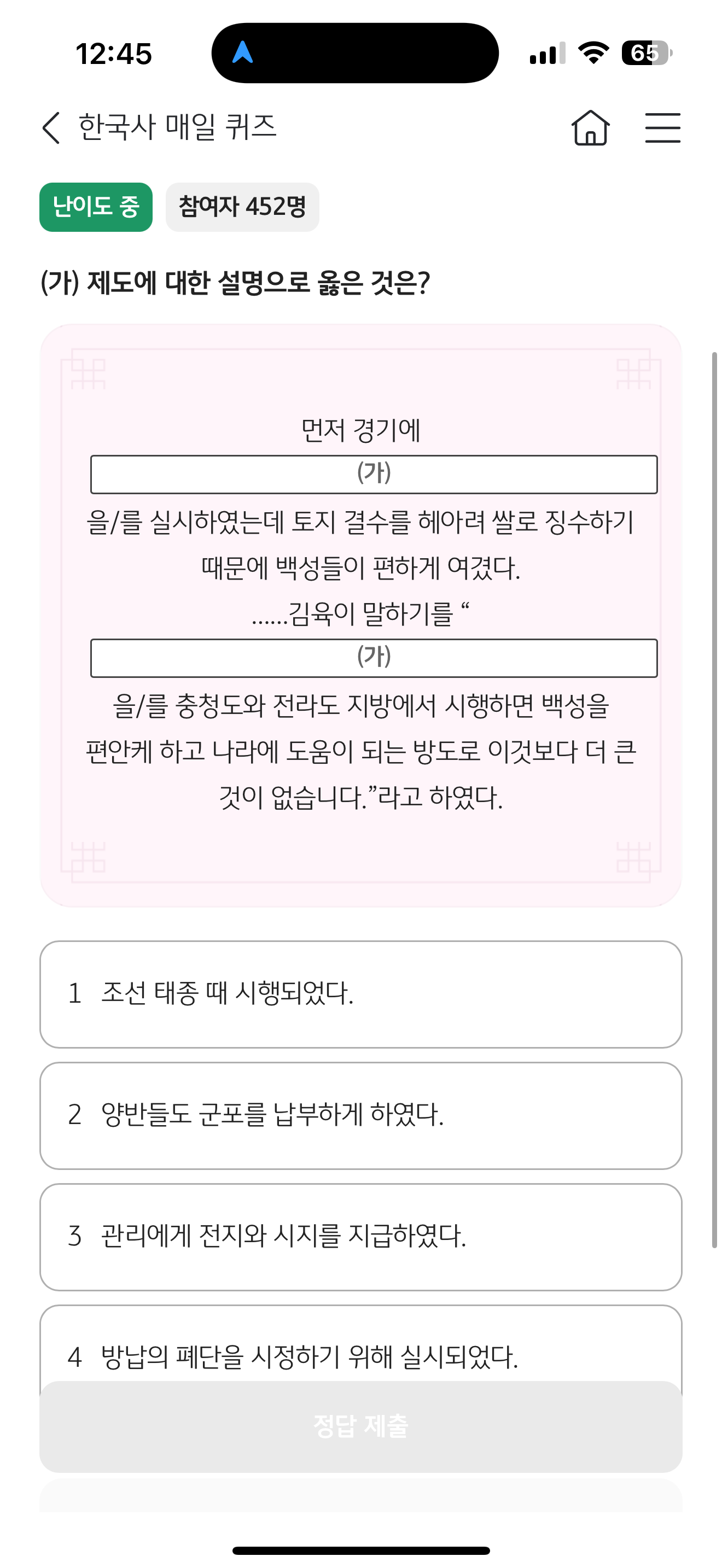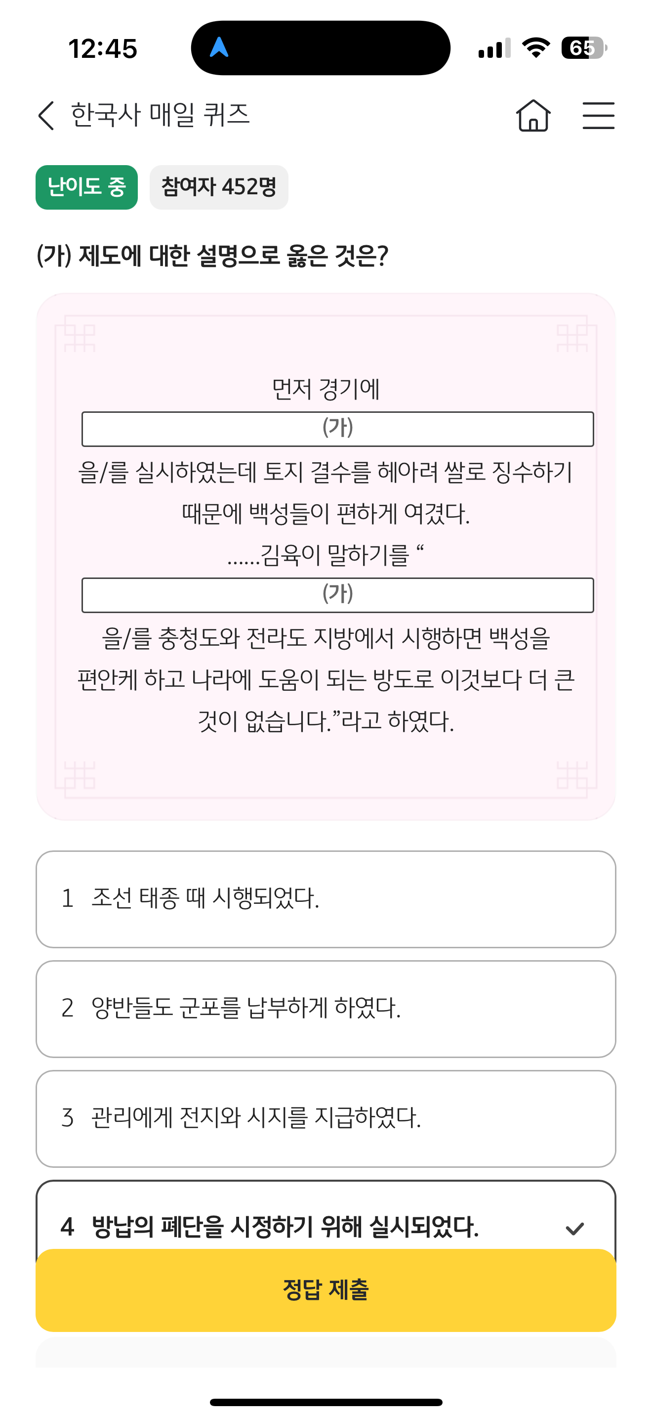 KB스타뱅킹 한국사 매일 퀴즈 4월 26일 정답(먼저 경기에 (가) 을/를 실시하였는데 토지 결수를 헤아려 쌀로 징수하기 때문에 백성들이 편하게 여겼다. .... 김육이 말하기를 (가) 을/를 충청도와 전라도 지방에서 시행하면 백성을 편안케 하고 나라에 도움이 되는 방도로 이것보다 더 큰것이 없습니다)