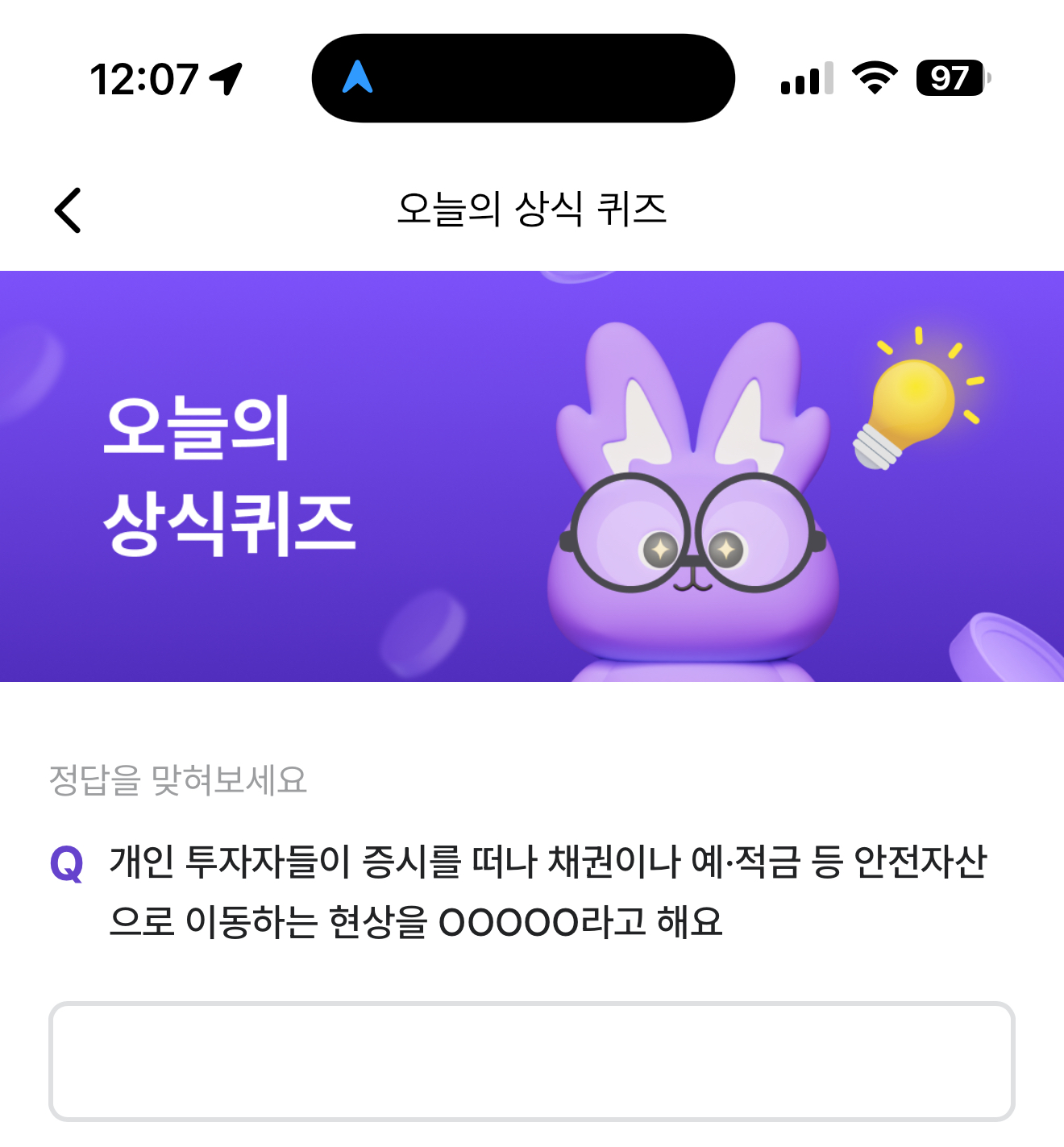 개인 투자자들이 증시를 떠나 채권이나 예 적금 등 안전자산으로 이동하는 현상을 OOOOO라고 해요. 주관식 퀴즈인데요. 주식 투자로 돈을 잃은 사람도 많고 주식 투자가 불안정하다는 평가가 이뤄지면서 많은 분들이 안전자산으로 이동하고 있습니다. 참고해 보세요
