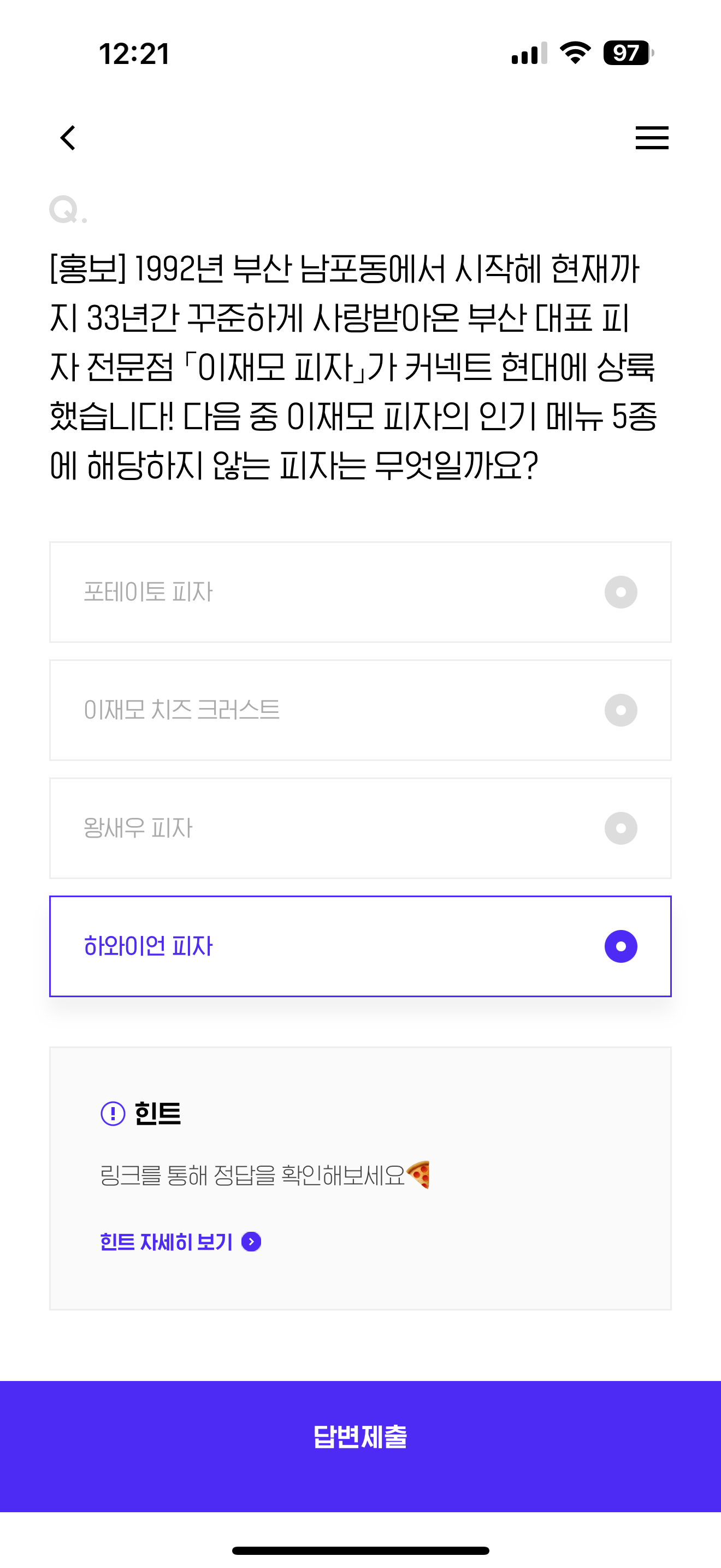 H포인트 퀴즈 정답은 하와이언 피자 입니다
