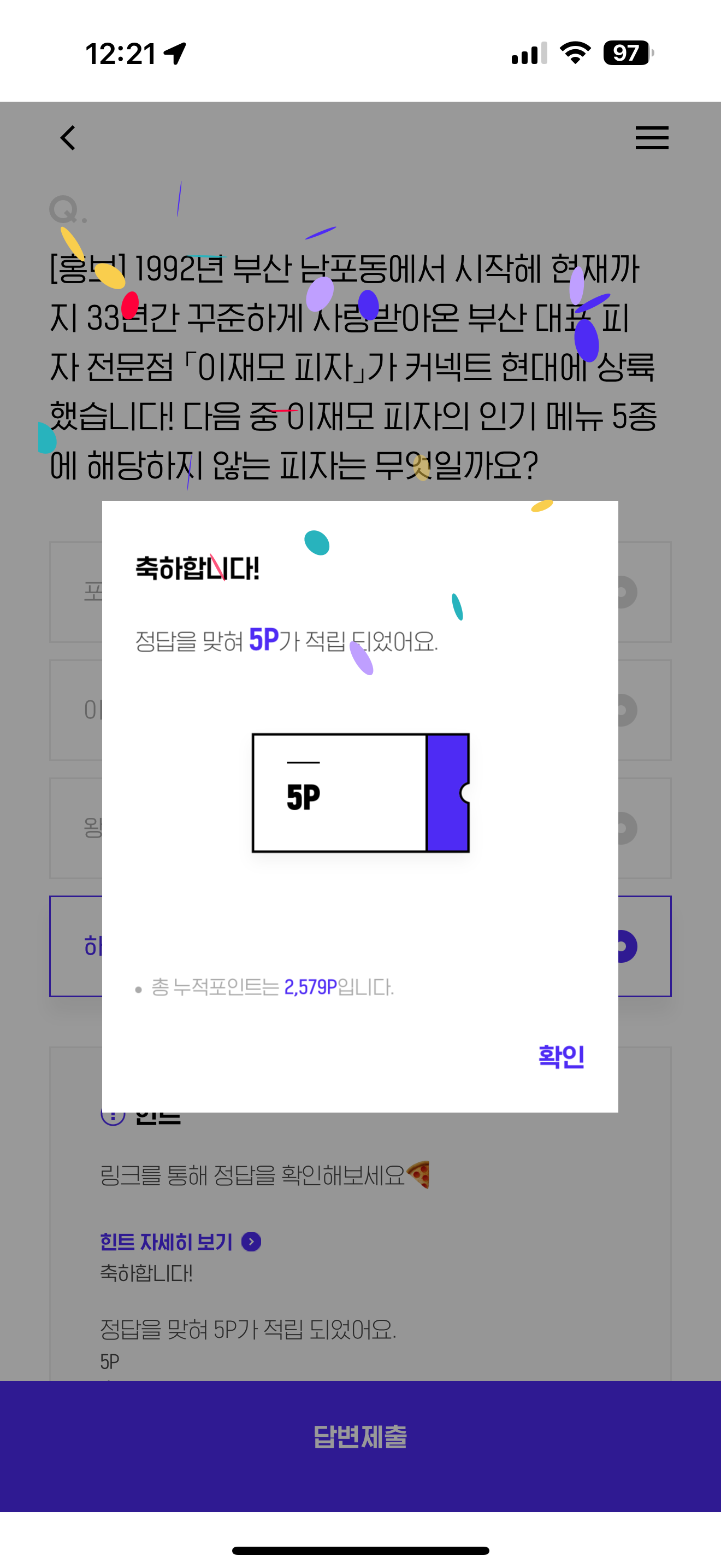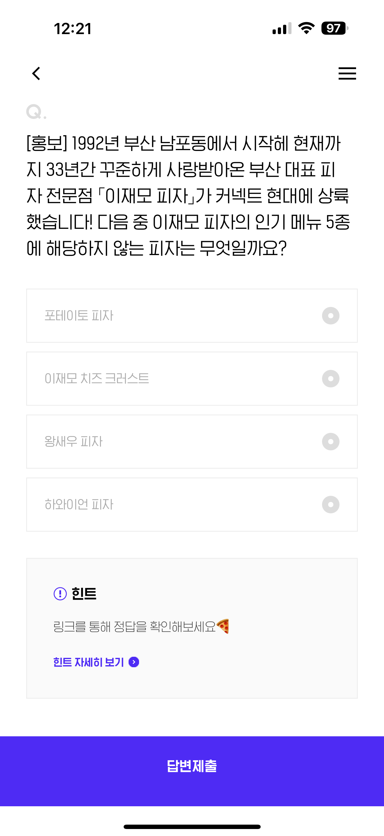 H포인트 퀴즈 4월 29일 정답(1992년 부산 남포동에서 시작해 현재까지 33년간 꾸준하게 사랑받아온 부산 대표 피자 전문점 이재모 피자가 커넥트 현대에 상륙 했습니다! 다음 중 이재모 피자의 인기 메뉴 5종에 해당하지 않는 피자는 무엇일까요?)