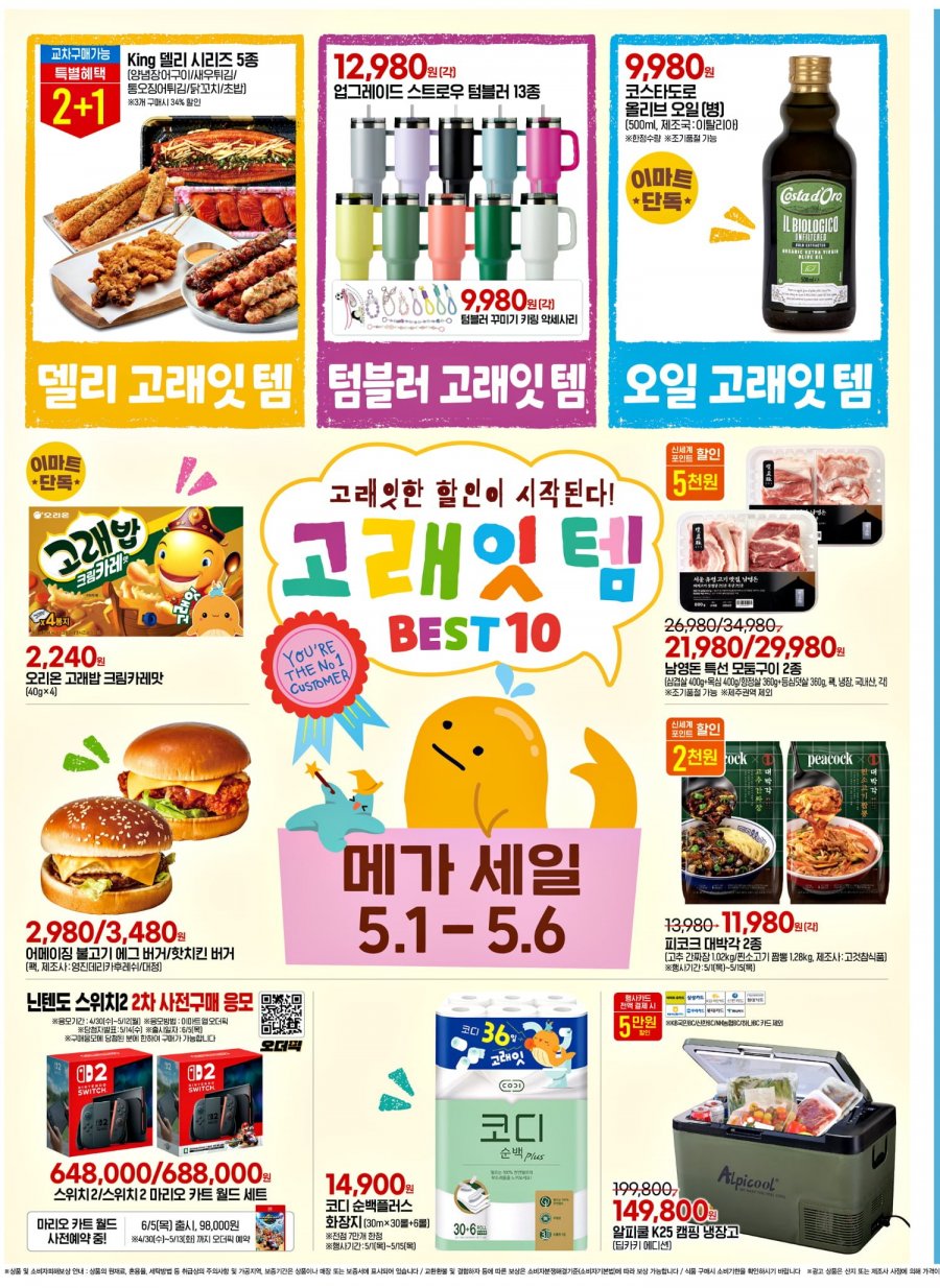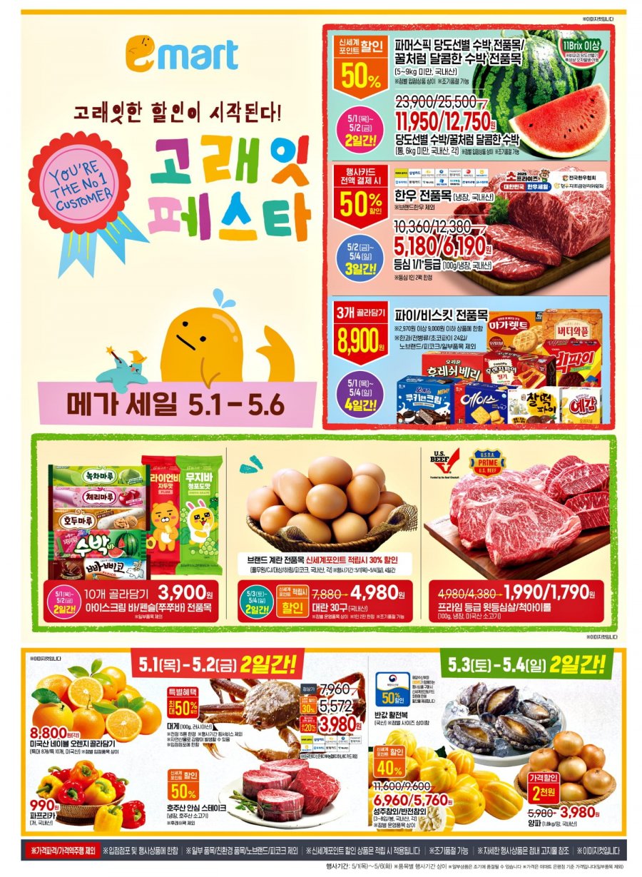 이마트에 오랜만에 많이들 몰리겠네요. 2025년 5월 1일~6일 이마트 고래잇 페스타 행사 전단지이지만 초반에 좋은 상품들은 금방 소진이 될 것 같으니 서둘러서 가보세요