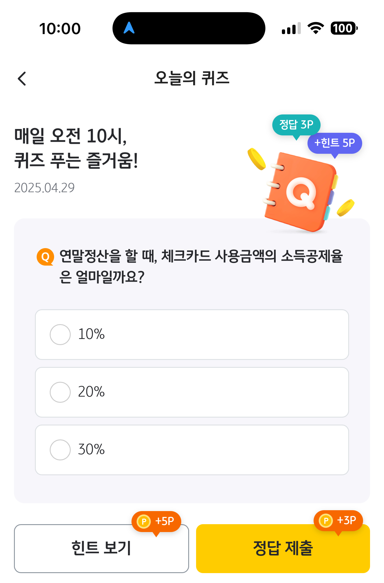 연말정산을 할 때, 체크카드 사용금액의 소득공제율은 얼마일까요? 보기는 1. 10% 2. 20% 3. 30% 입니다. 연말정산을 할 때 소득공제를 잘 받는게 절세를 하는데 굉장히 중요한 포인트입니다. 카드 사용과 체크카드 사용은 혜택이 다르니 잘 참고해서 활용해 보세요