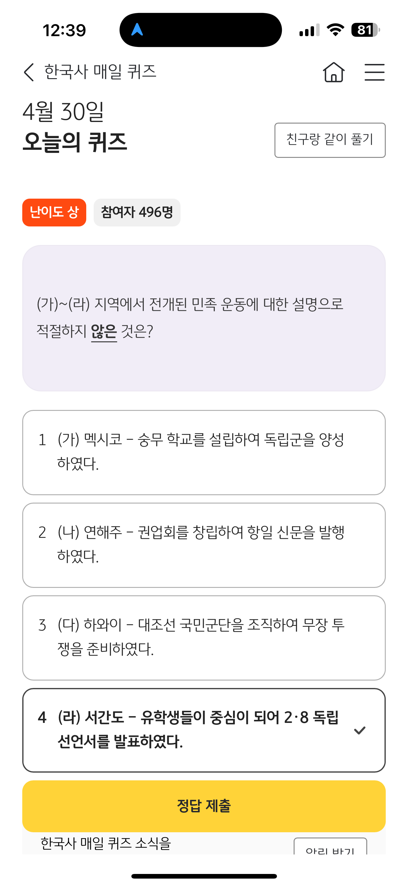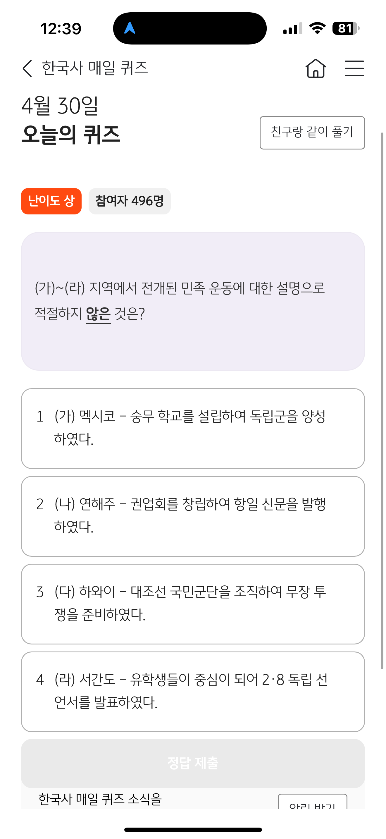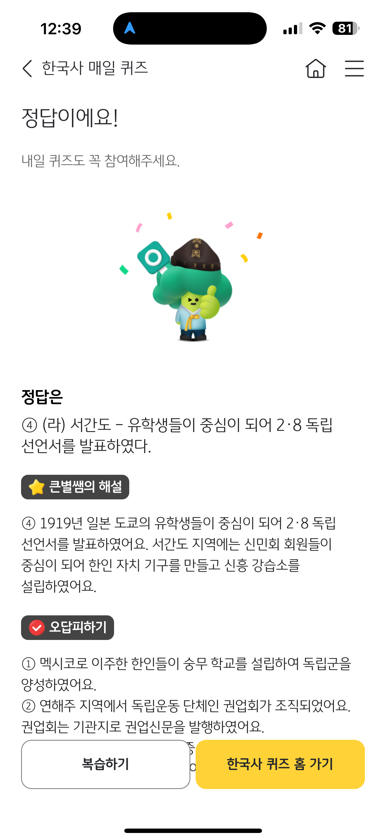 KB스타뱅킹 한국사 매일 퀴즈 정답은 서간도 - 유학생들이 중심이 되어 2.8 독립 선언서를 발표하였다