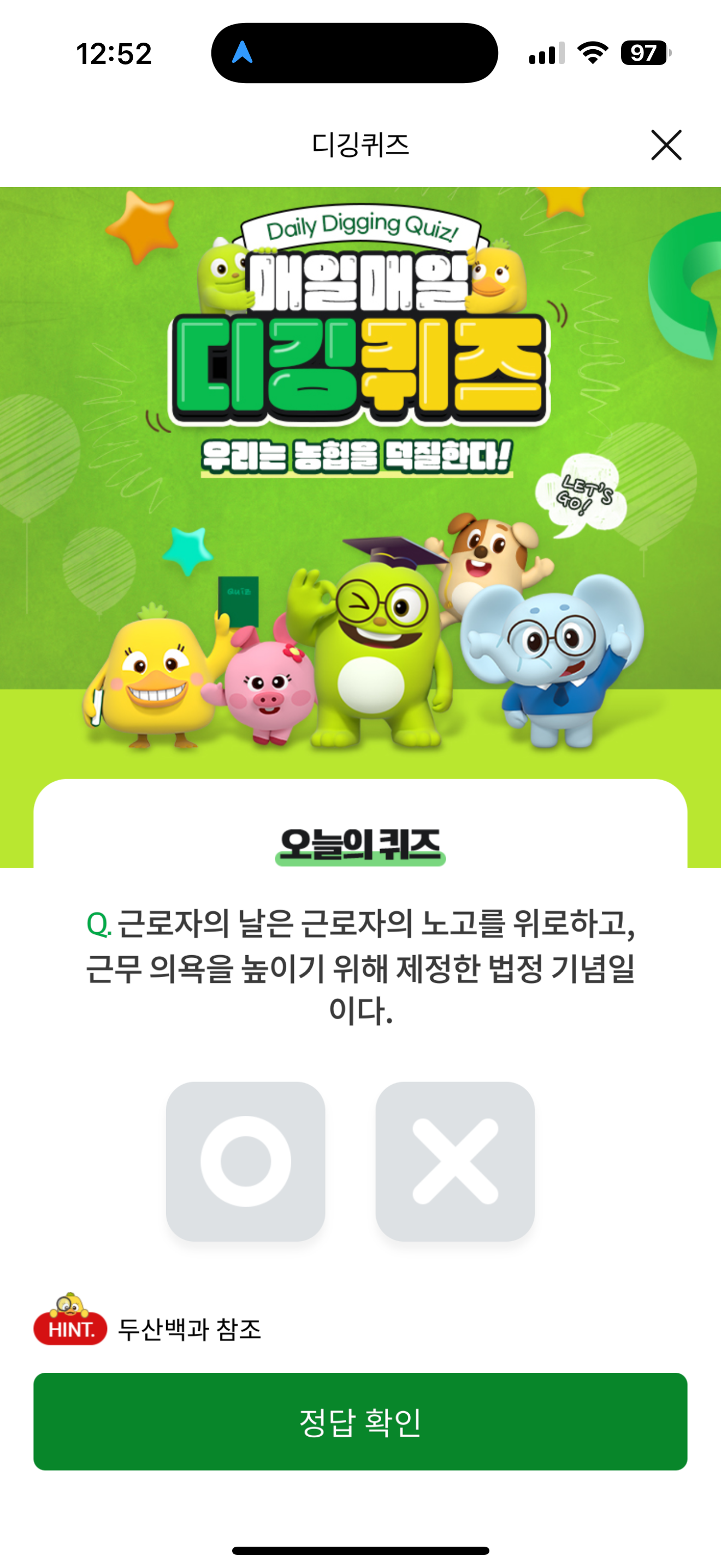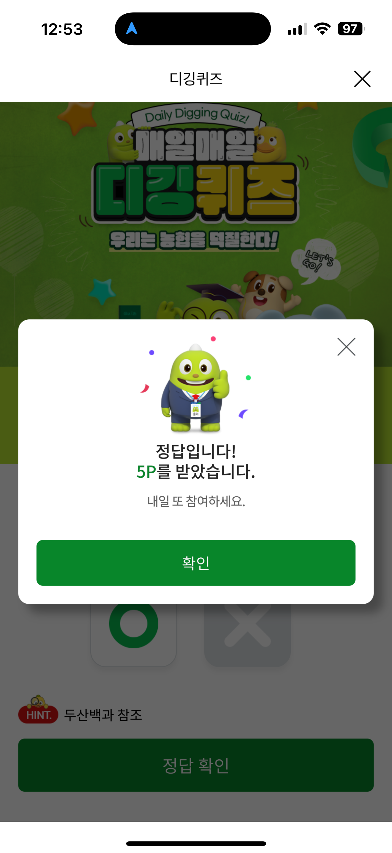 NH올원뱅크 디깅퀴즈 정답은 O 입니다