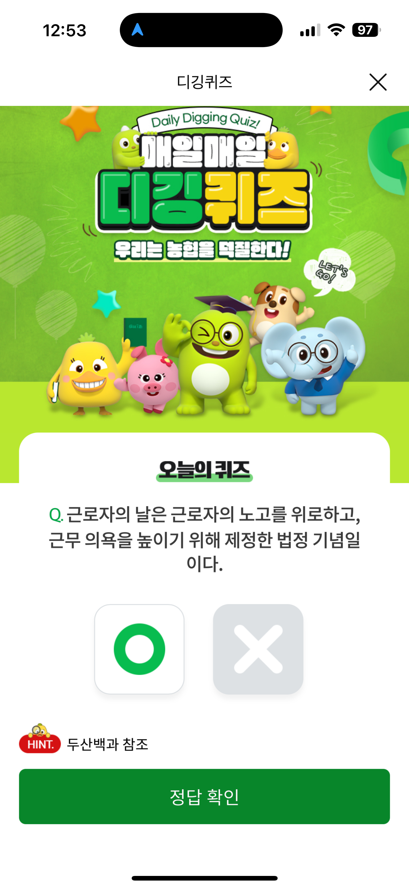 NH올원뱅크 디깅퀴즈 정답은 O 입니다