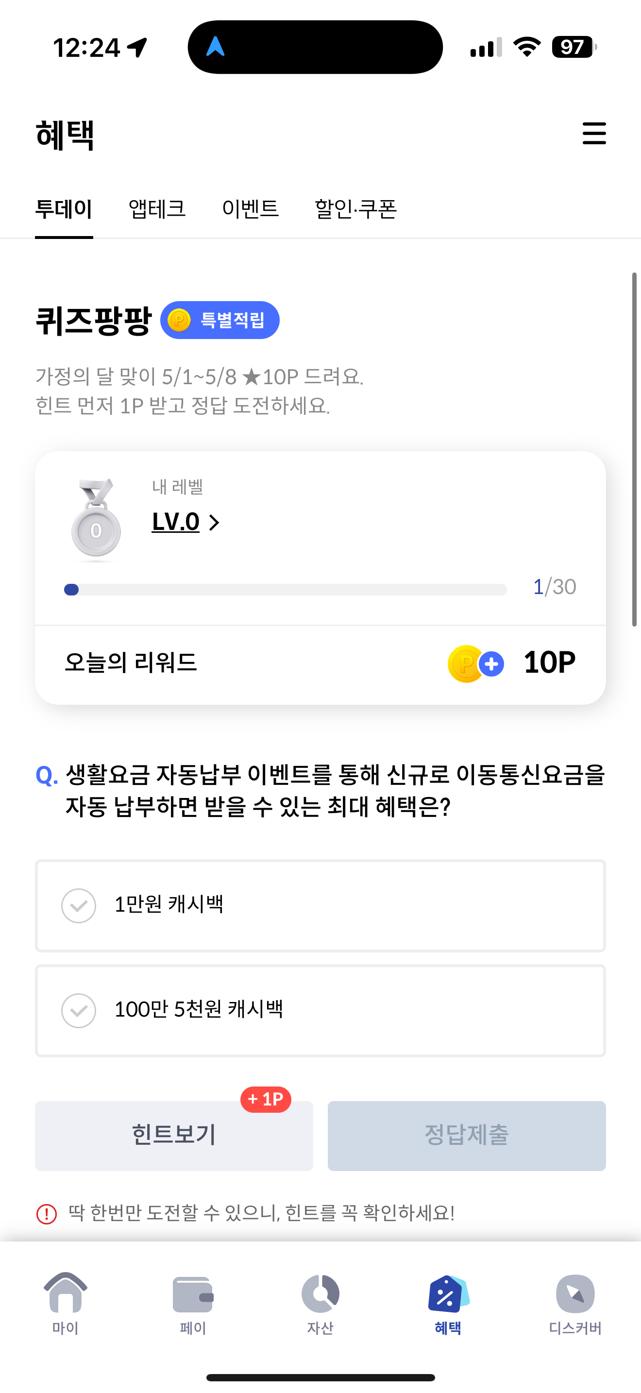 신한카드 퀴즈팡팡 정답은 100만 5천원 캐시백 입니다