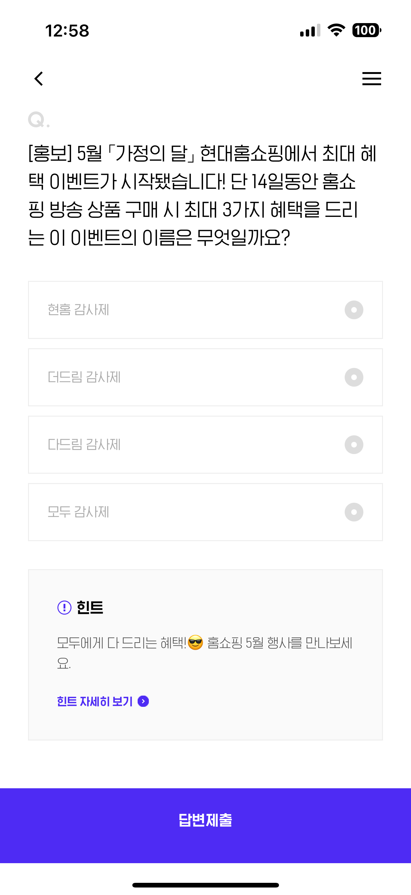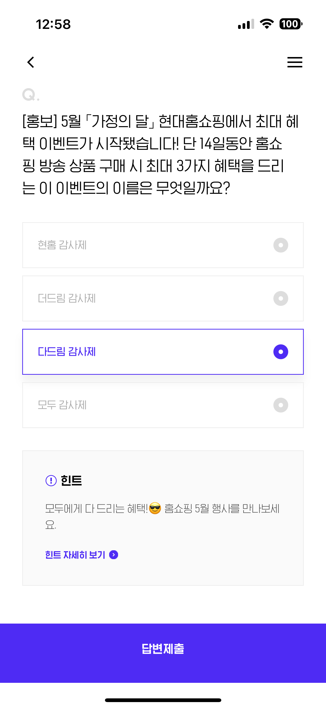 5월 가정의 달 현대홈쇼핑에서 최대 혜택 이벤트가 시작됐습니다! 단 14일동안 홈쇼핑 방송 상품 구매 시 최대 3가지 혜택을 드리는 이 이벤트의 이름은 무엇일까요? 보기는 1. 현홈 감사제 2. 더드림 감사제 3. 다드림 감사제 4. 모두 감사제 입니다.