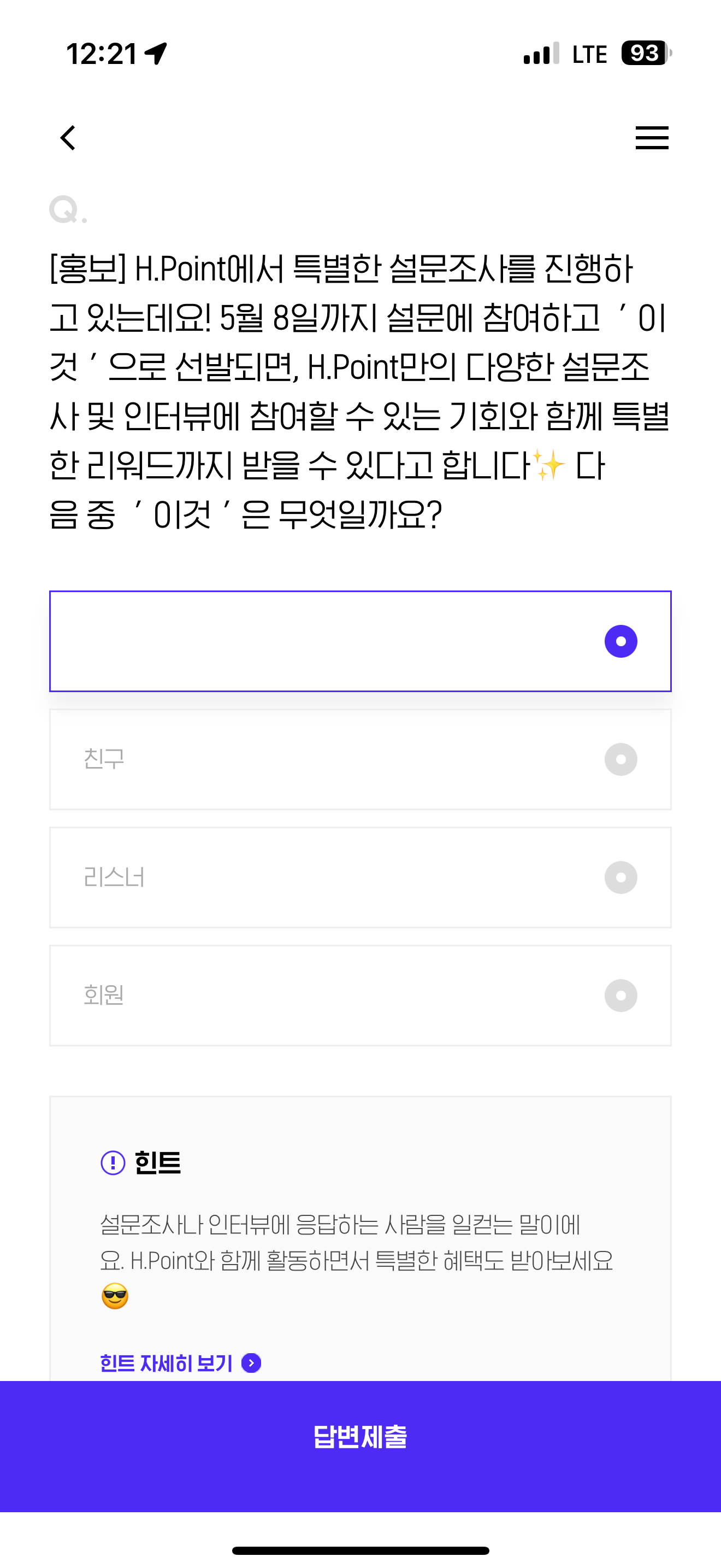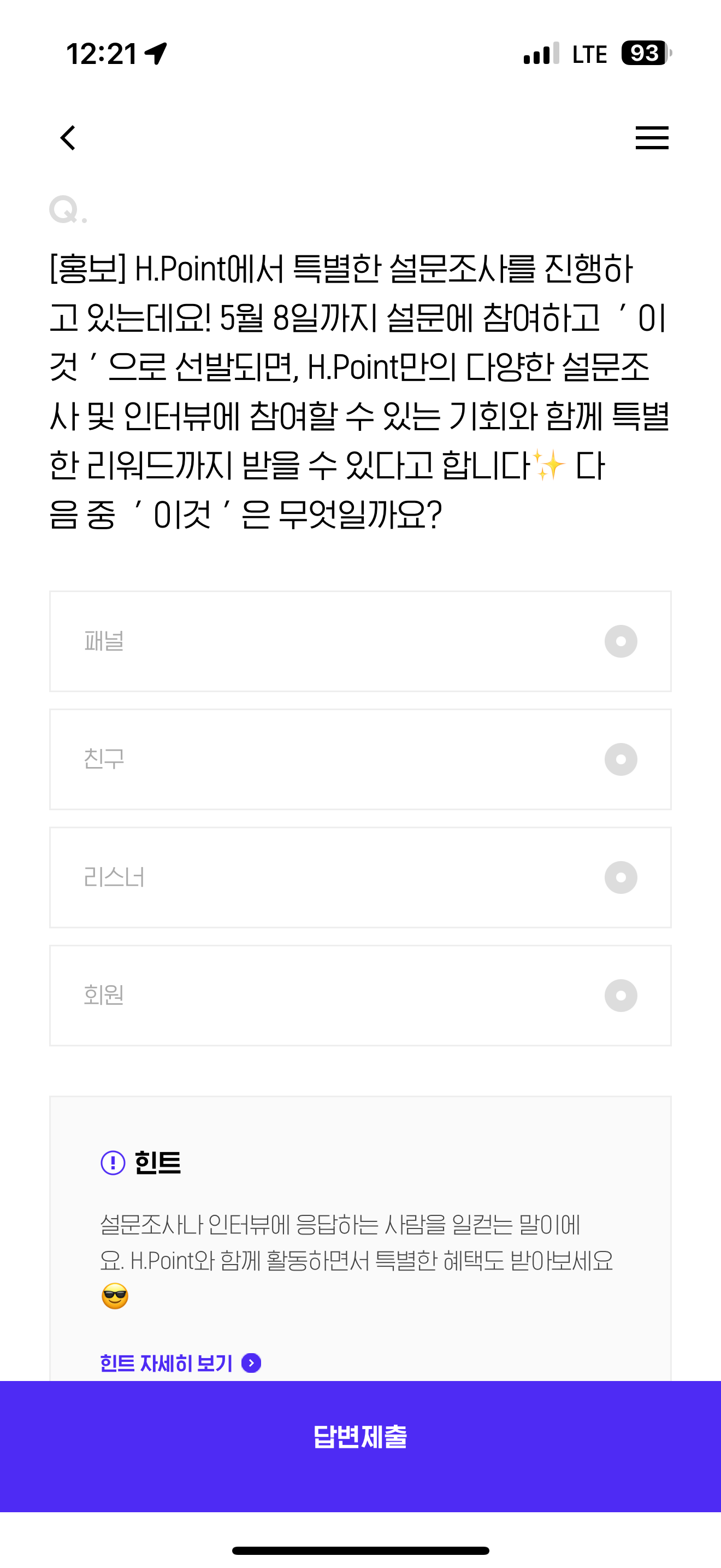 H.Point에서 특별한 설문조사를 진행하고 있는데요! 5월 8일까지 설문에 참여하고 ' 이것 ' 으로 선발되면, H.Point만의 다양한 설문조사 및 인터뷰에 참여할 수 있는 기회와 함께 특별한 리워드까지 받을 수 있다고 합니다 다음 중 ' 이것 ' 은 무엇일까요? 보기는 1. 패널 2. 친구 3. 리스터 4. 회원 입니다.