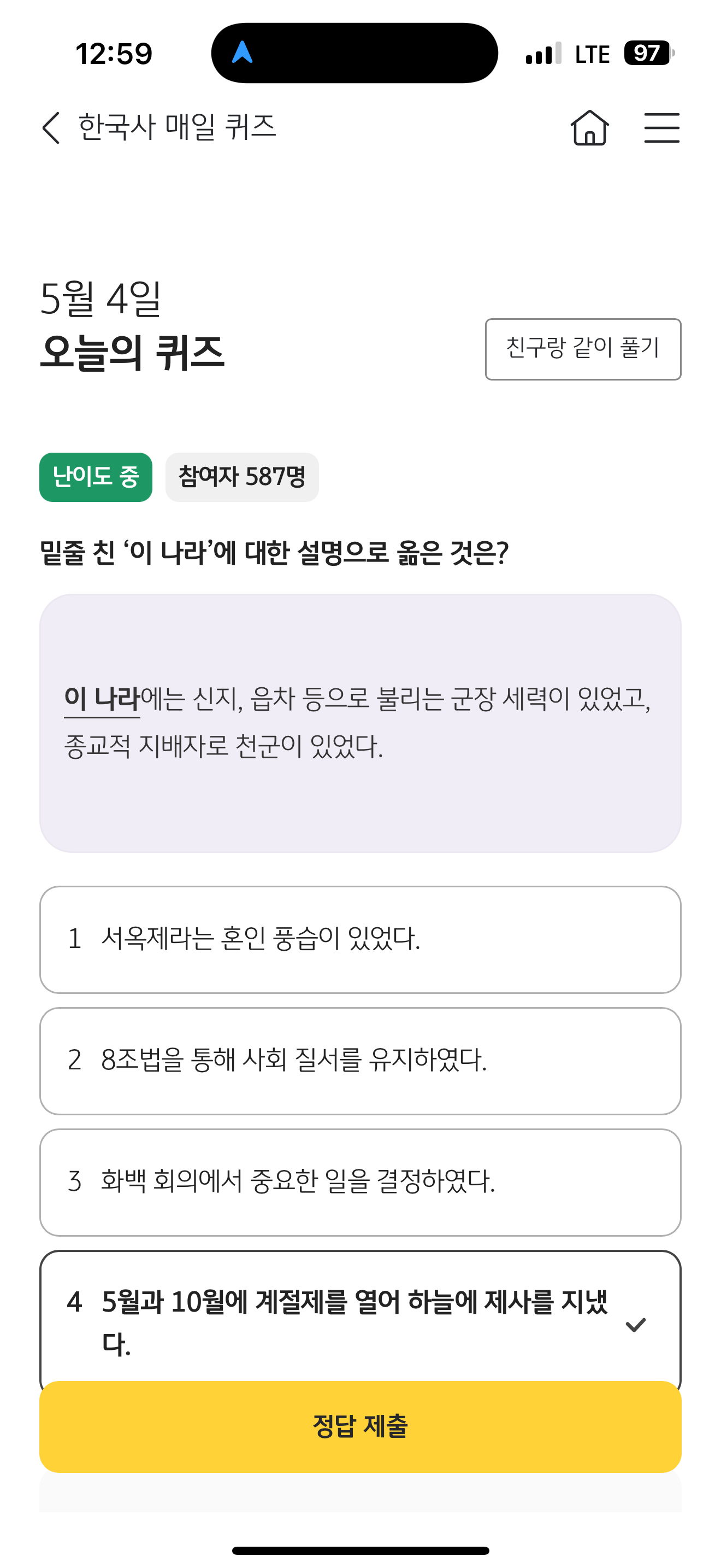KB스타뱅킹 한국사 매일 퀴즈 5월 4일 정답(이 나라에는 신지, 읍차 등으로 불리는 군장 세력이 있었고, 종교적 지배자로 천군이 있었다)