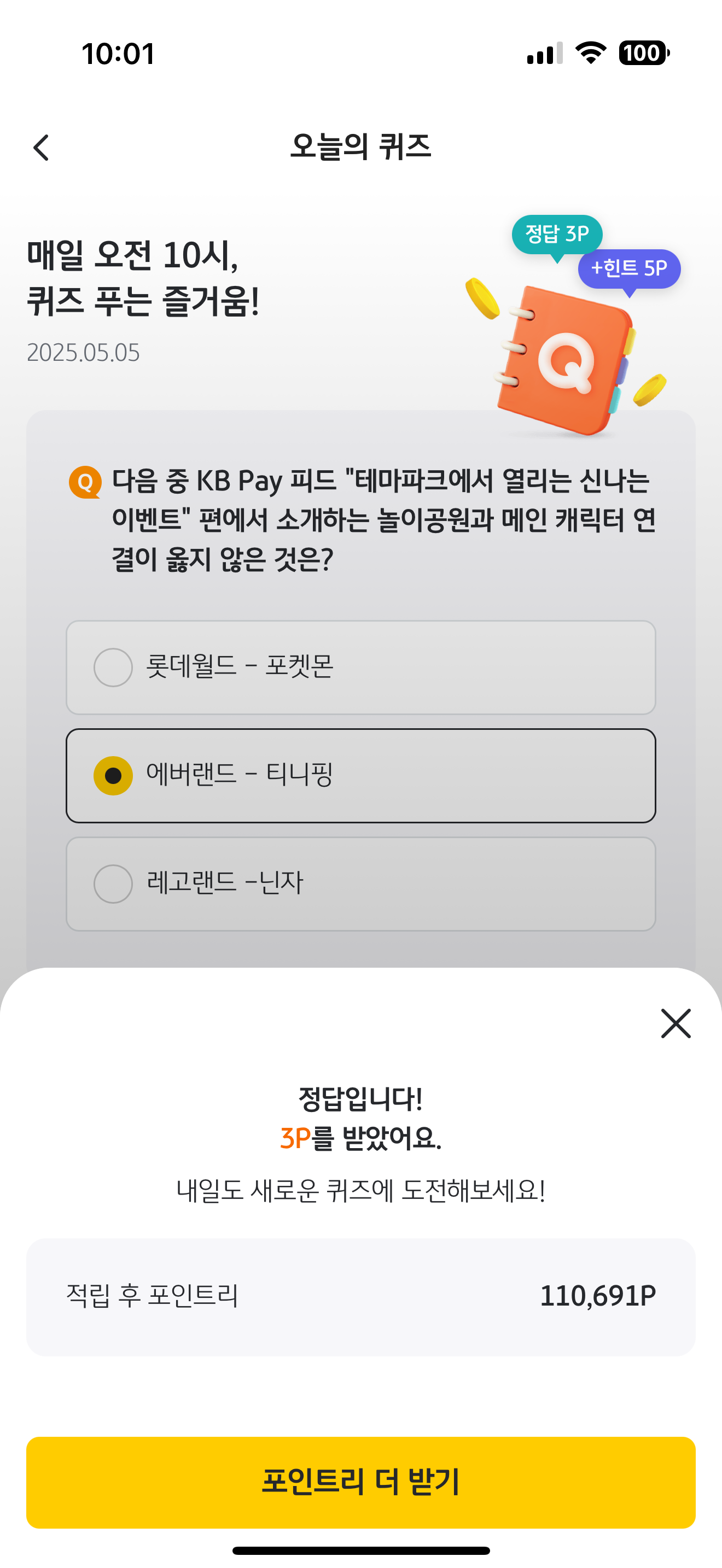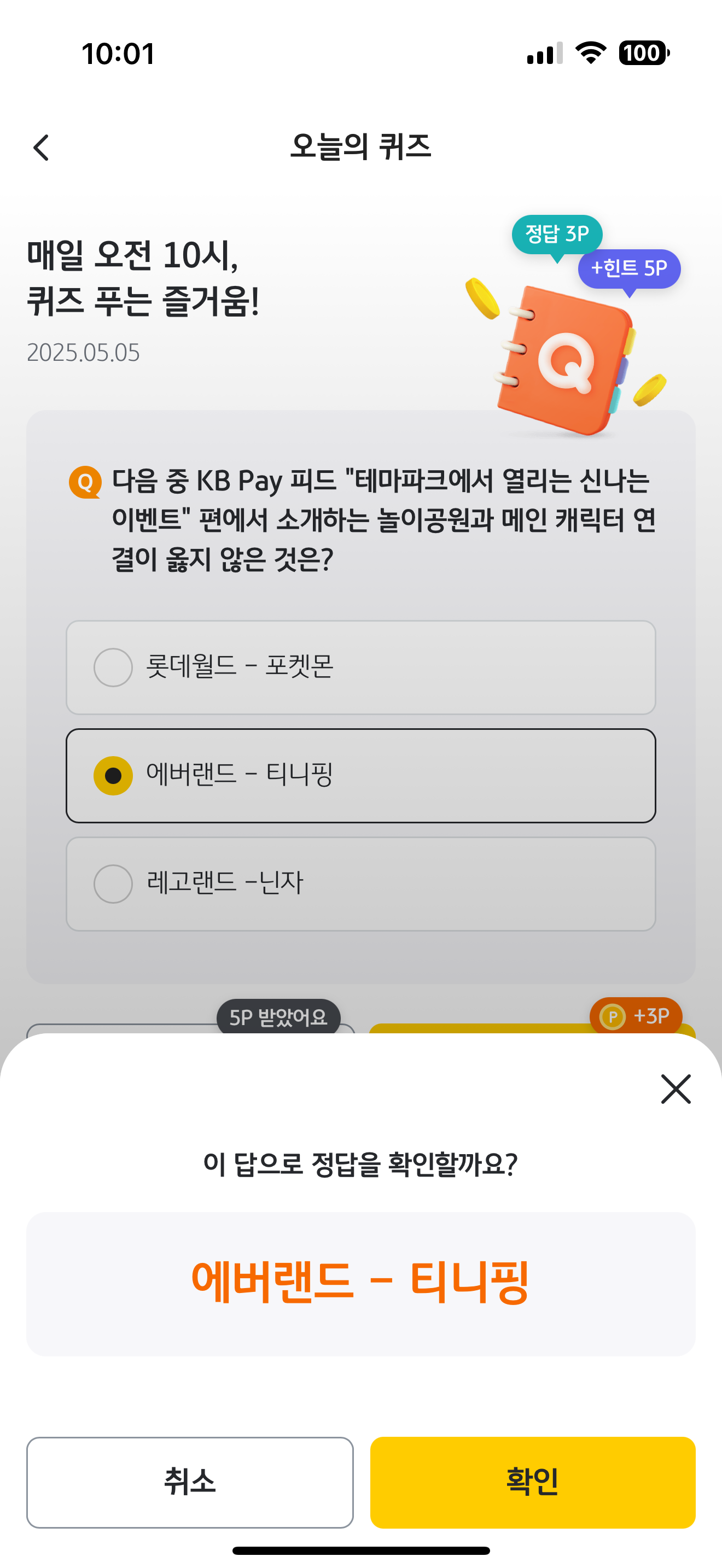KB pay 오늘의 퀴즈 정답은 에버랜드 - 티니핑 입니다