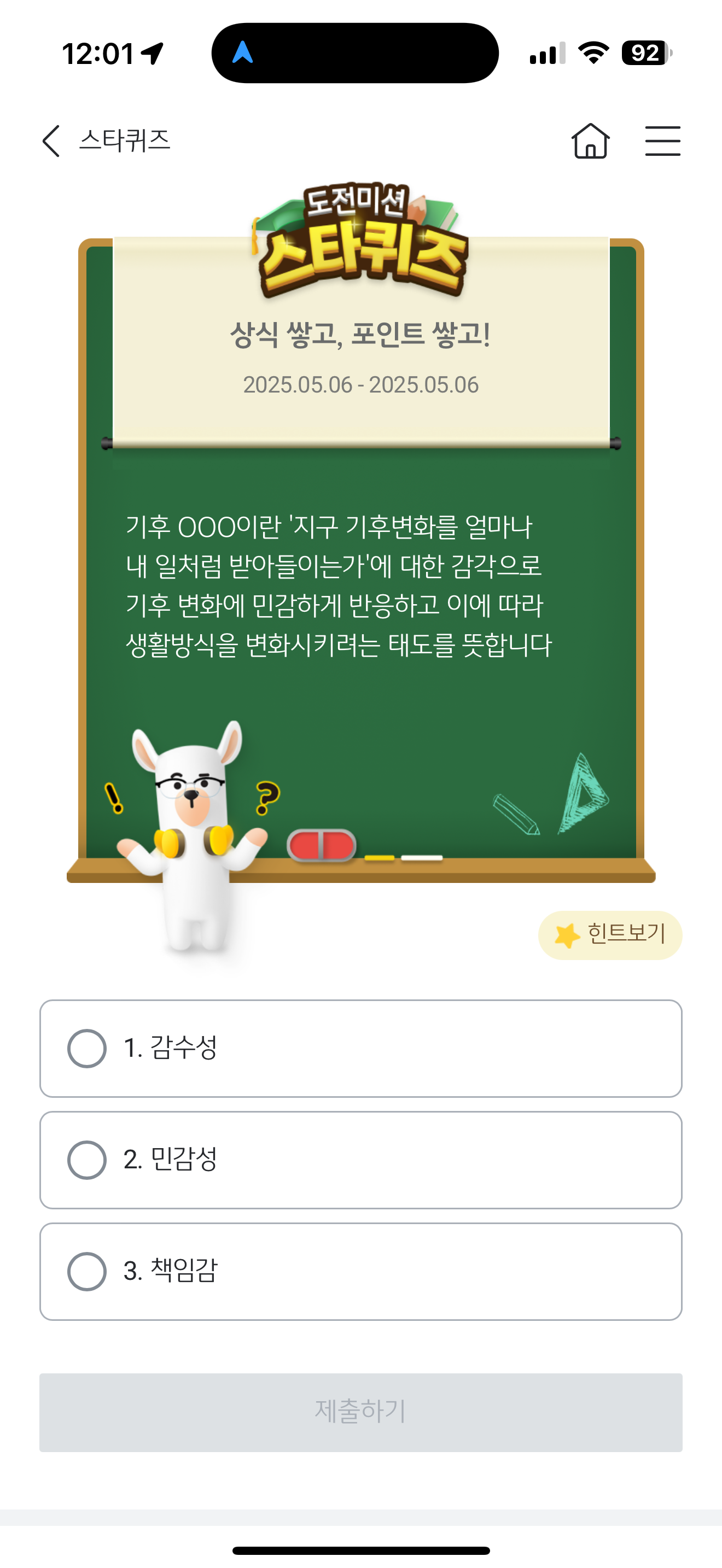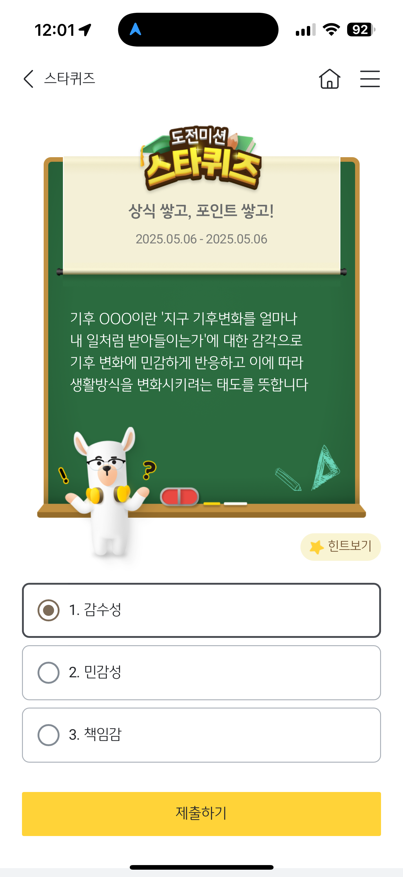 기후 OOO이란 '지구 기후변화를 얼마나 내 일처럼 받아들이는가'에 대한 감각으로 기후 변화에 민감하게 반응하고 이에 따라 생활방식을 변화시키려는 태도를 뜻합니다 보기는 1. 감수성 2. 민감성 3. 책임감 입니다. 환경 문제로 지구가 많이 아픕니다. 이걸 공감하는게 중요하죠.