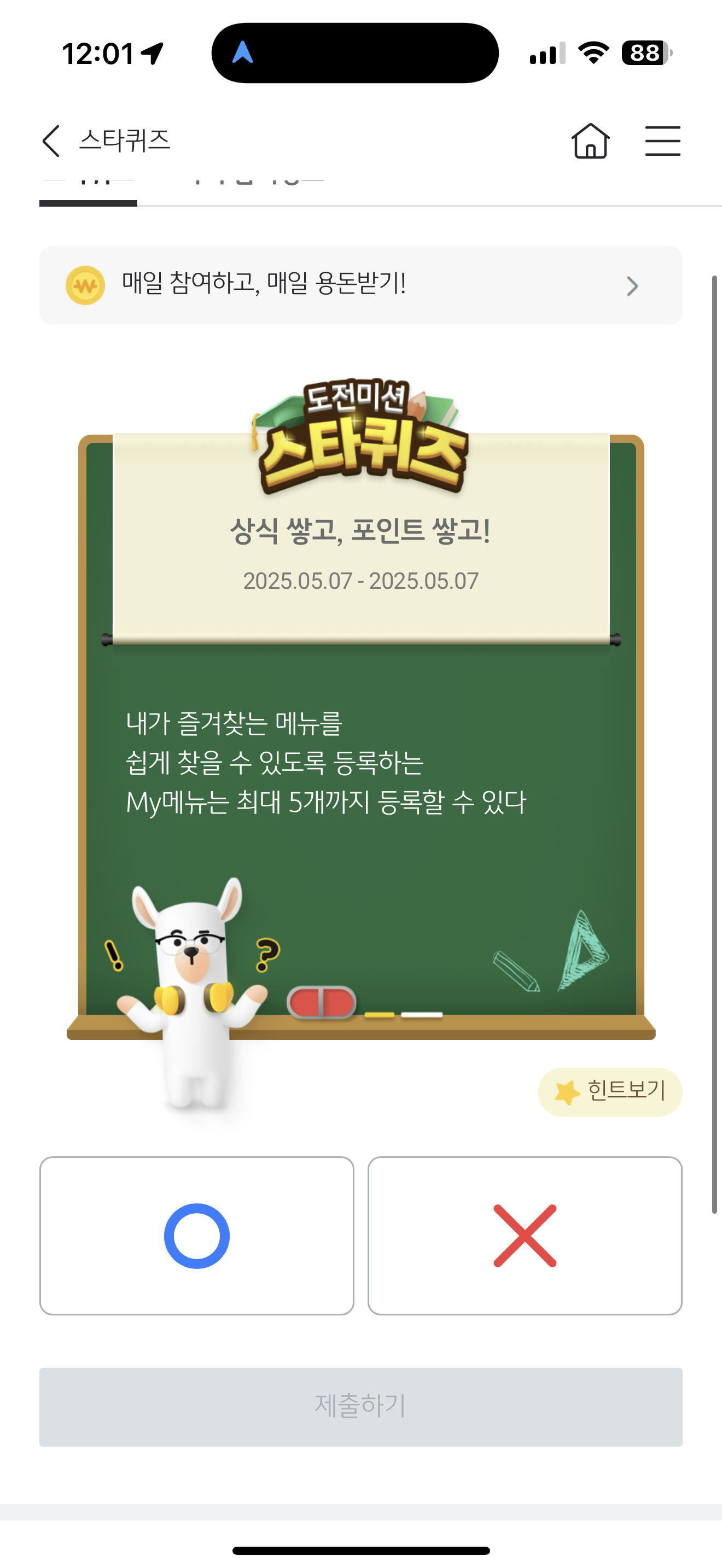 내가 즐겨찾는 메뉴를 쉽게 찾을 수 있도록 등록하는 My메뉴는 최대 5개까지 등록할 수 있다 O, X 퀴즈인데요. KB스타뱅킹에서는 자주 사용하는 기능을 즐겨찾기 메뉴에 등록해 더욱 간편하게 사용이 가능합니다. 최대 몇개까지 등록해서 사용 가능한지 잘 참고해서 활용해 보세요