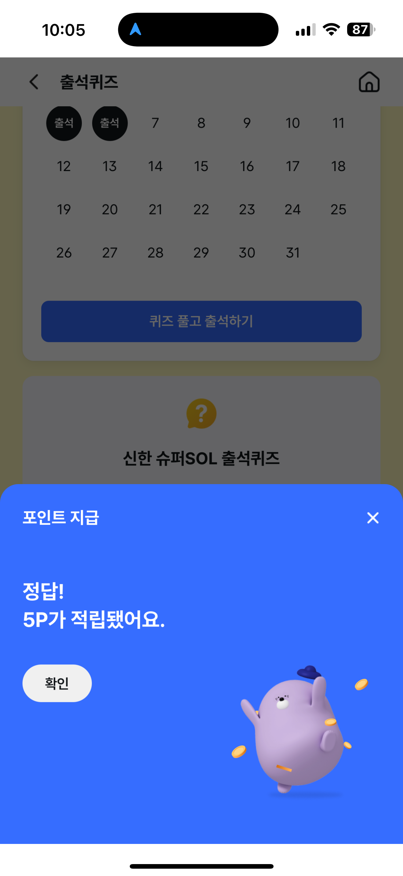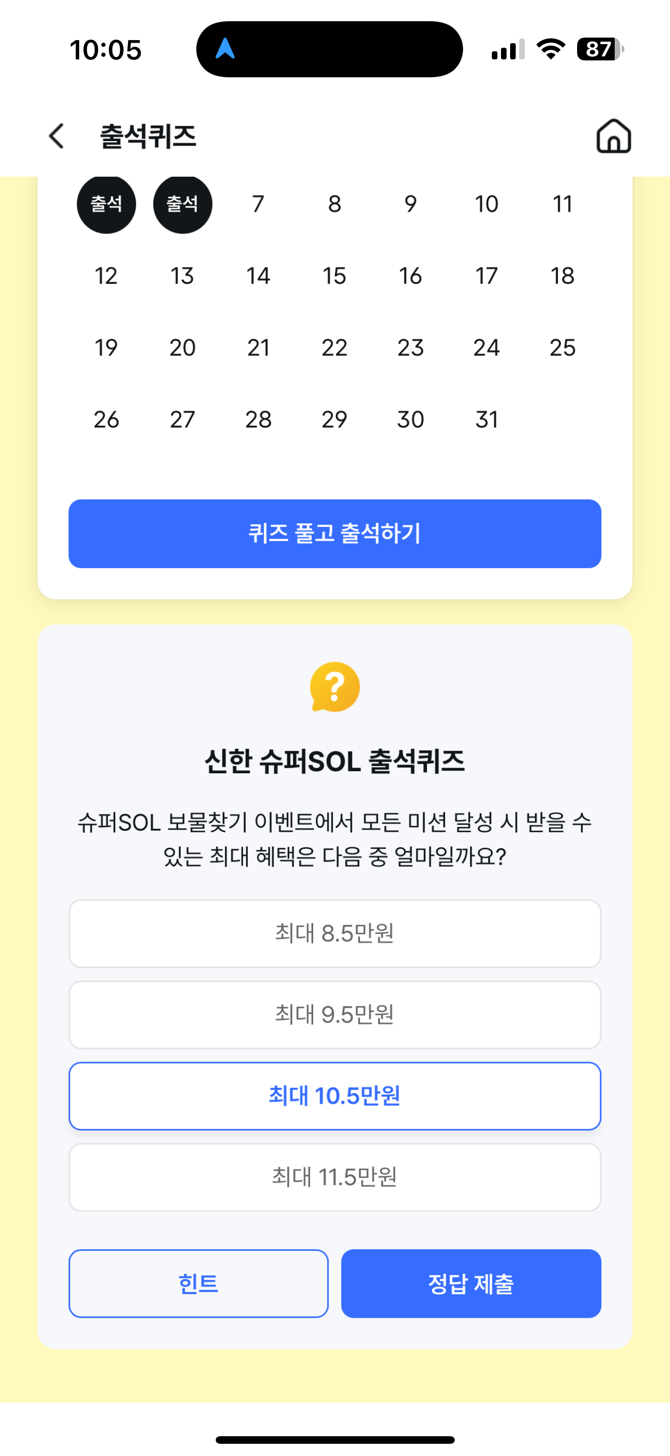 신한 슈퍼SOL 출석퀴즈 정답은 최대 10.5만원 입니다