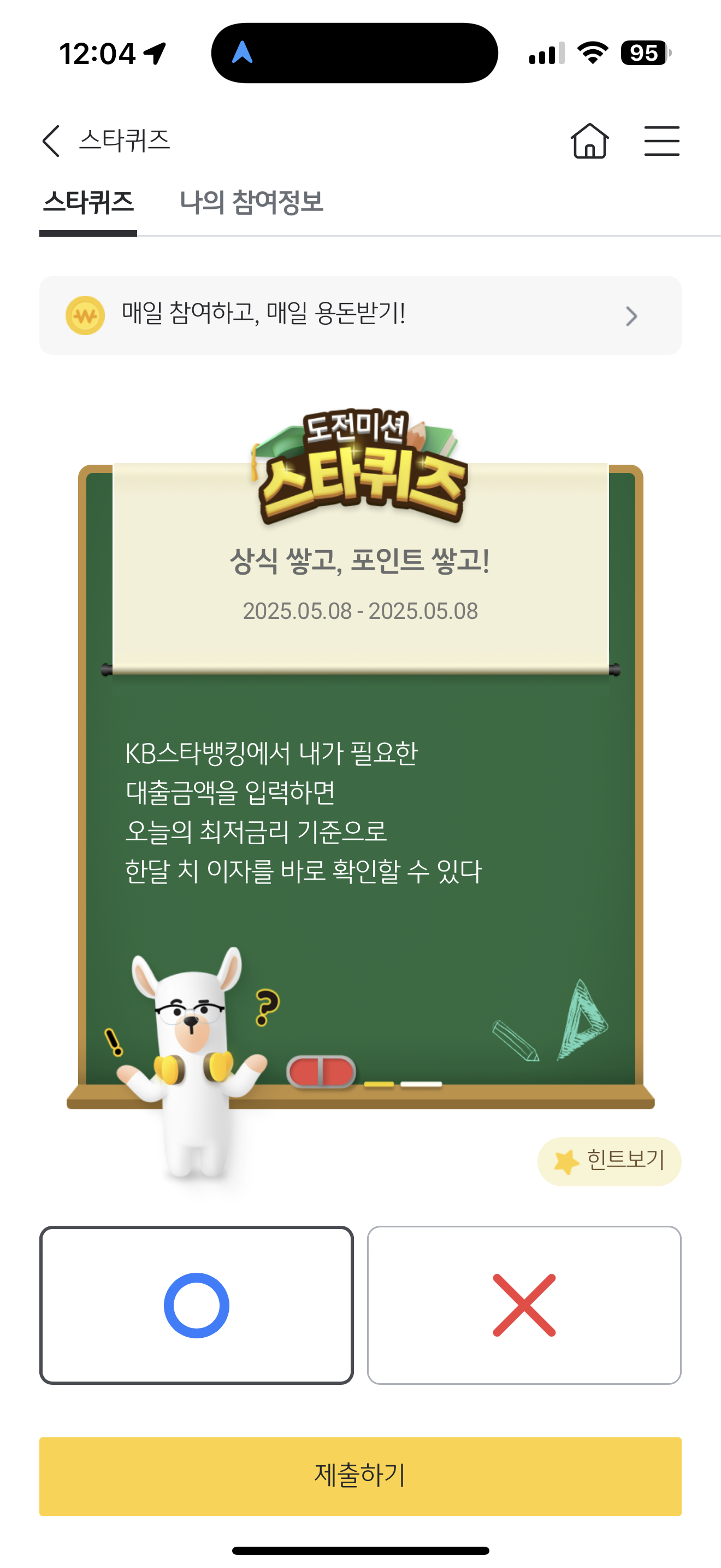 KB스타뱅킹 스타퀴즈 5월 8일 정답(KB스타뱅킹에서 내가 필요한 대출금액을 입력하면 오늘의 최저금리 기준으로 한달 치 이자를 바로 확인할 수 있다)