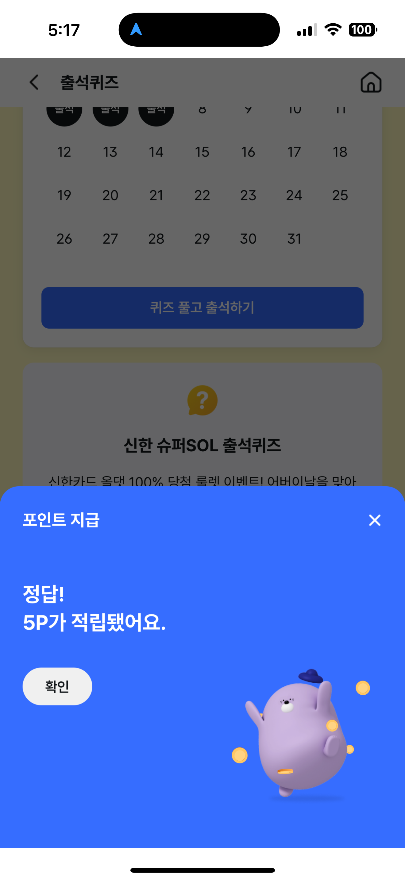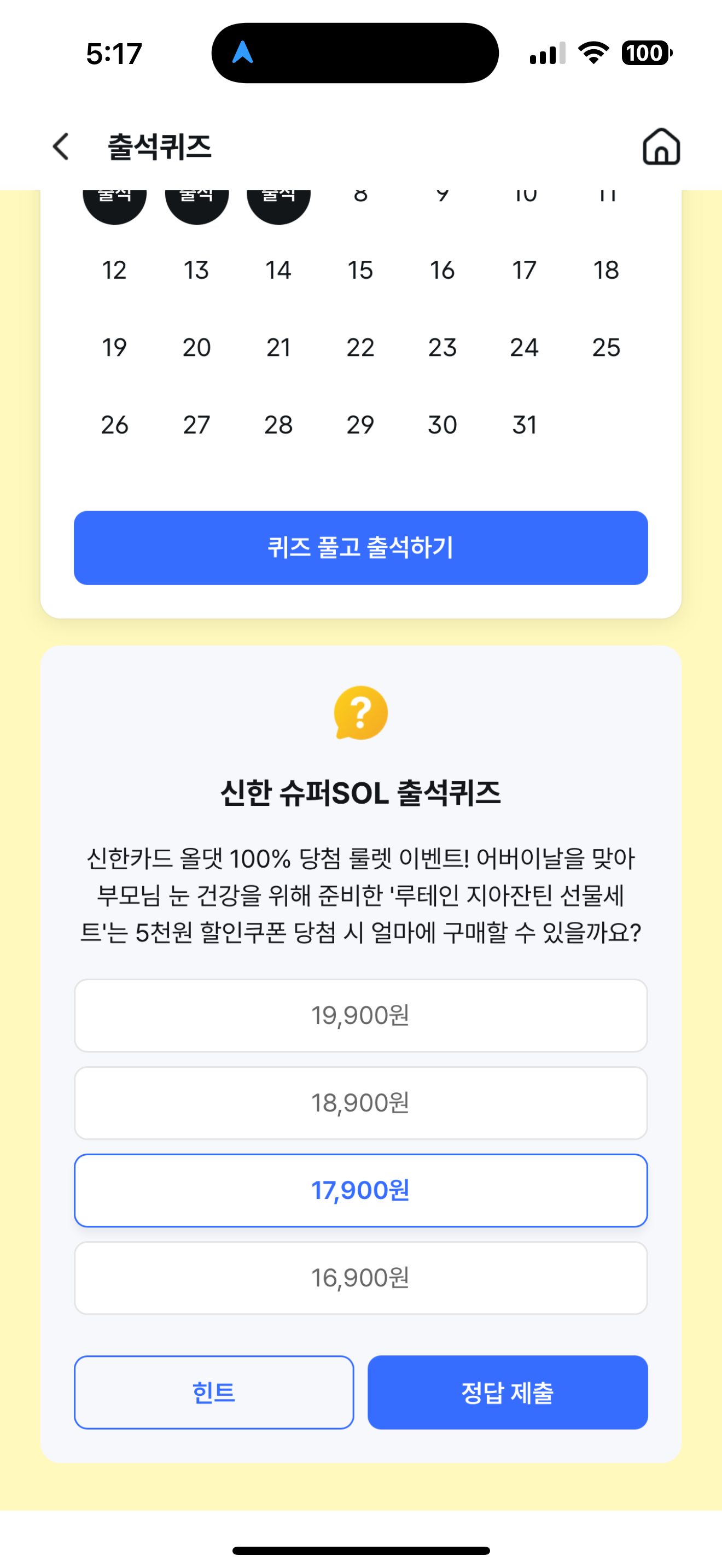 신한 슈퍼SOL 출석퀴즈 정답은 17,900원 입니다