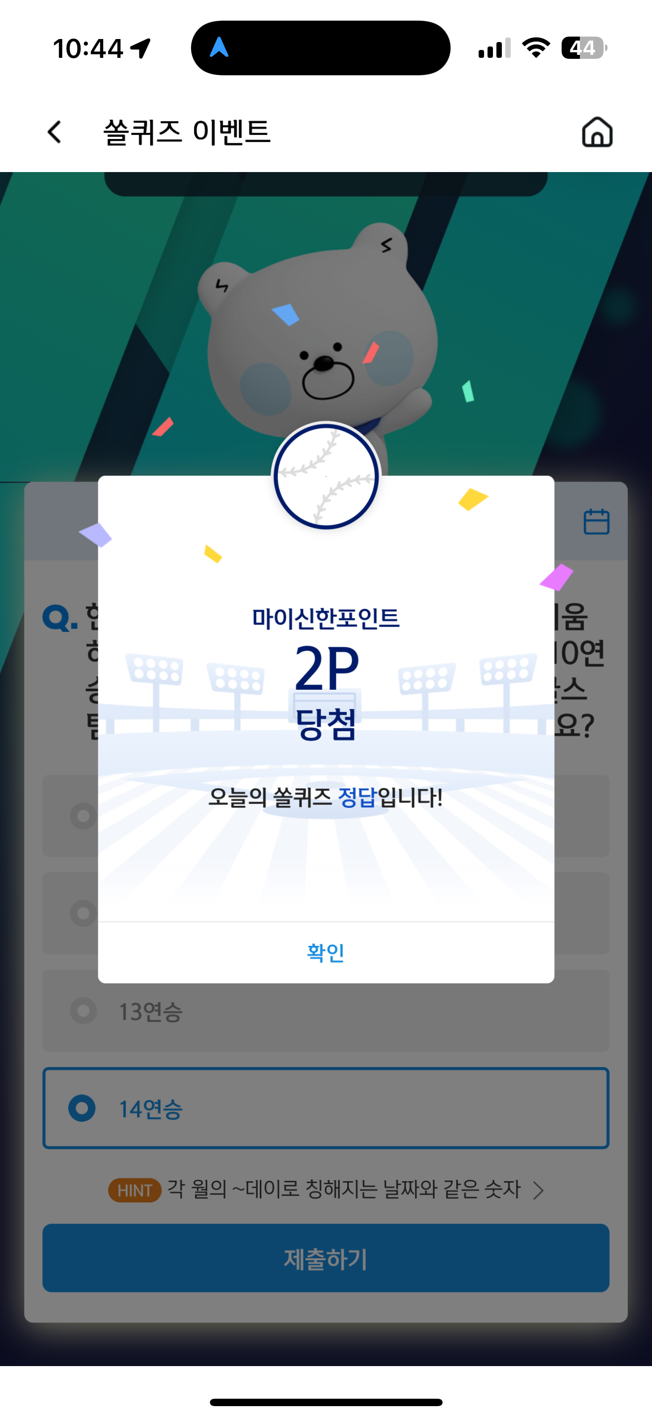 신한 슈퍼SOL 야구/상식 쏠퀴즈 정답은 14연승 입니다