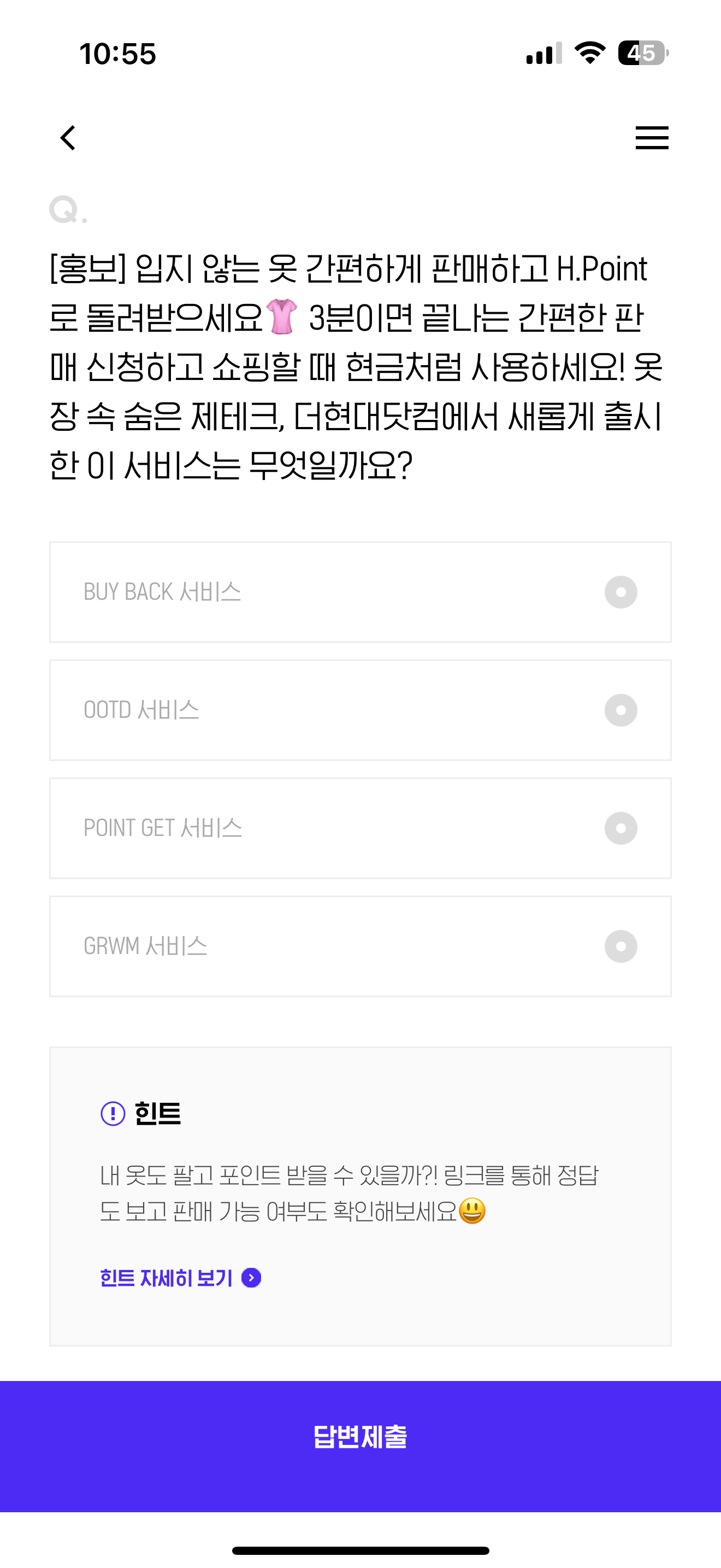 입지 않는 옷 간편하게 판매하고 H.Point로 돌려받으세요 3분이면 끝나는 간편한 판매 신청하고 쇼핑할 때 현금처럼 사용하세요! 옷장 속 숨은 재테크, 더현대닷컴에서 새롭게 출시한 이 서비스는 무엇일까요? 보기는 1. BUY BACK 서비스 2. OOTD 서비스 3. POINT GET 서비스 4. GRWM 서비스 입니다