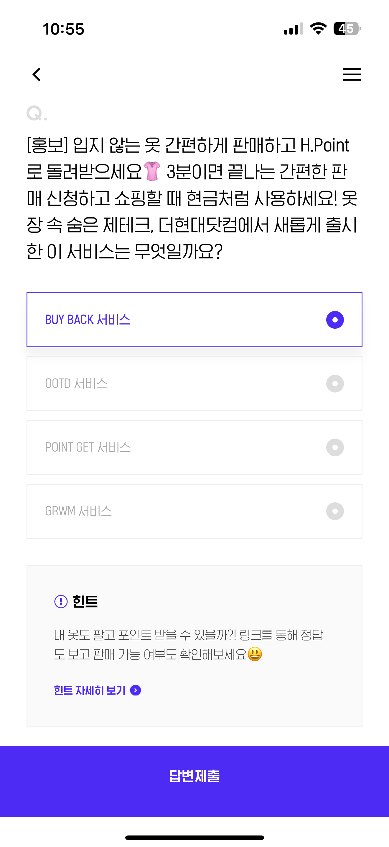 H포인트 퀴즈 정답은 BUY BACK 서비스 입니다