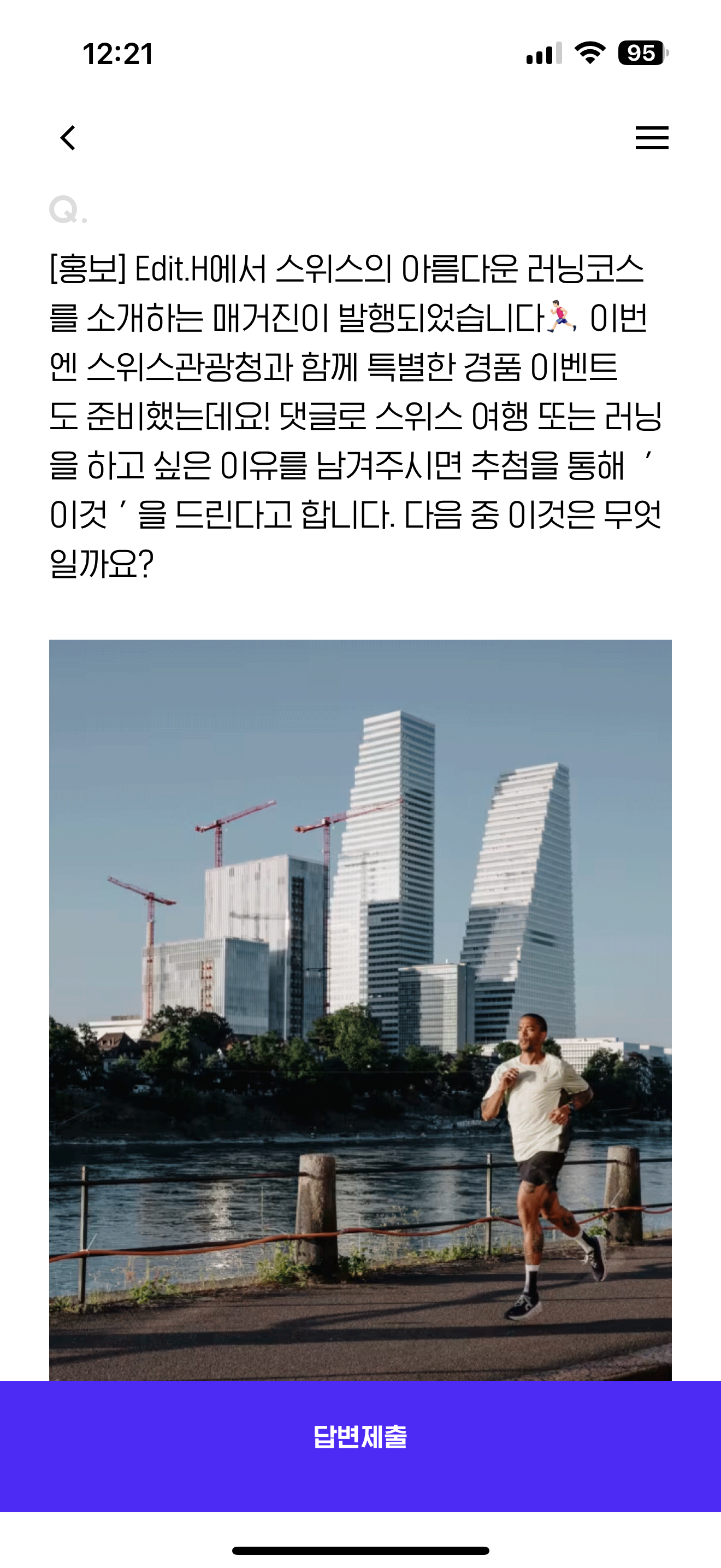 Edit.H에서 스위스의 아름다운 러닝코스를 소개하는 매거진이 발행되었습니다 이번엔 스위스관광청과 함께 특별한 경품 이벤트도 준비했는데요! 댓글로 스위스 여행 또는 러닝을 하고 싶은 이유를 남겨주시면 추첨을 통해 ' 이것 ' 을 드린다고 합니다. 다음 중 이것은 무엇일까요? 보기는 1. 스위스 초콜릿 2. 트래블 패스 1등석 3. 호텔 숙박권 4. 캠핑카 이용권 입니다