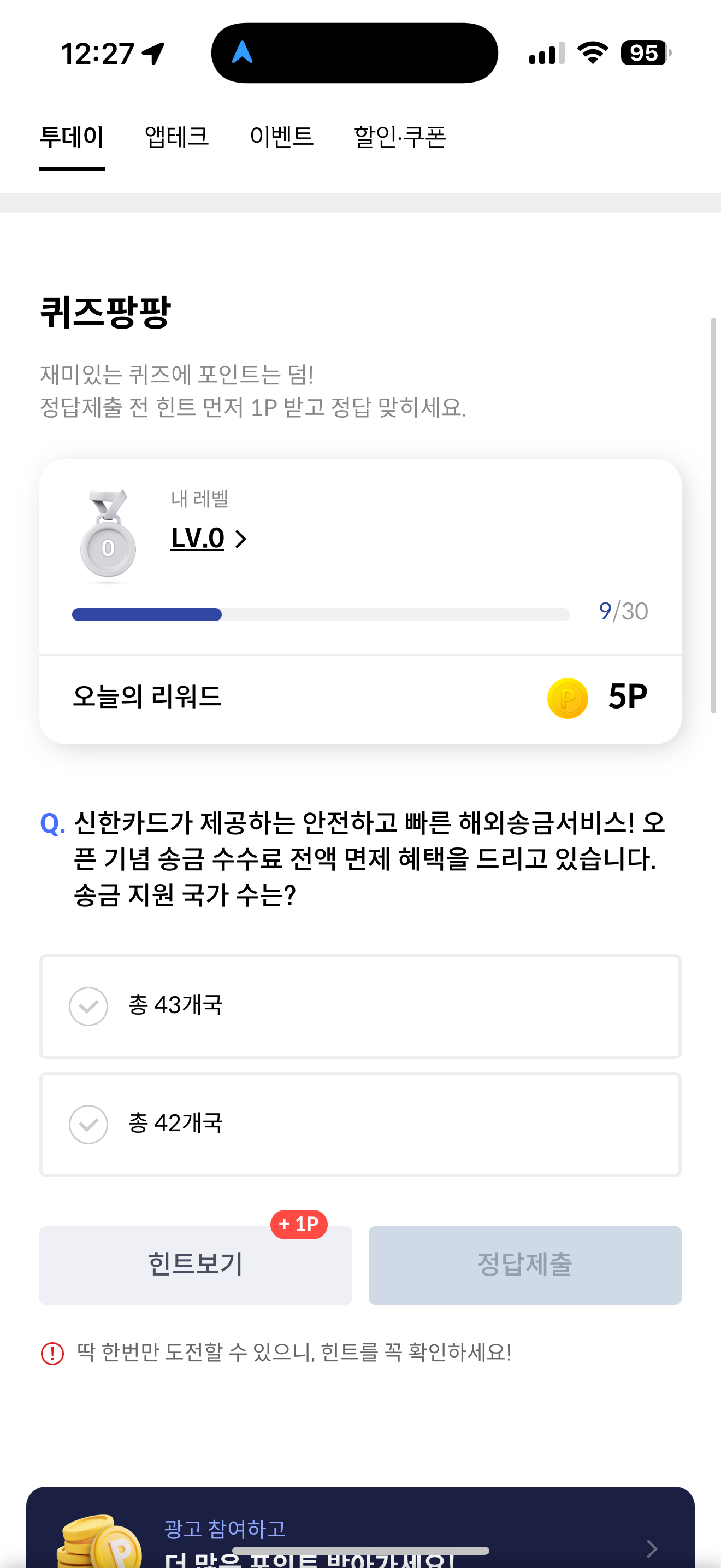 신한카드 퀴즈팡팡 정답은 총 43개국 입니다