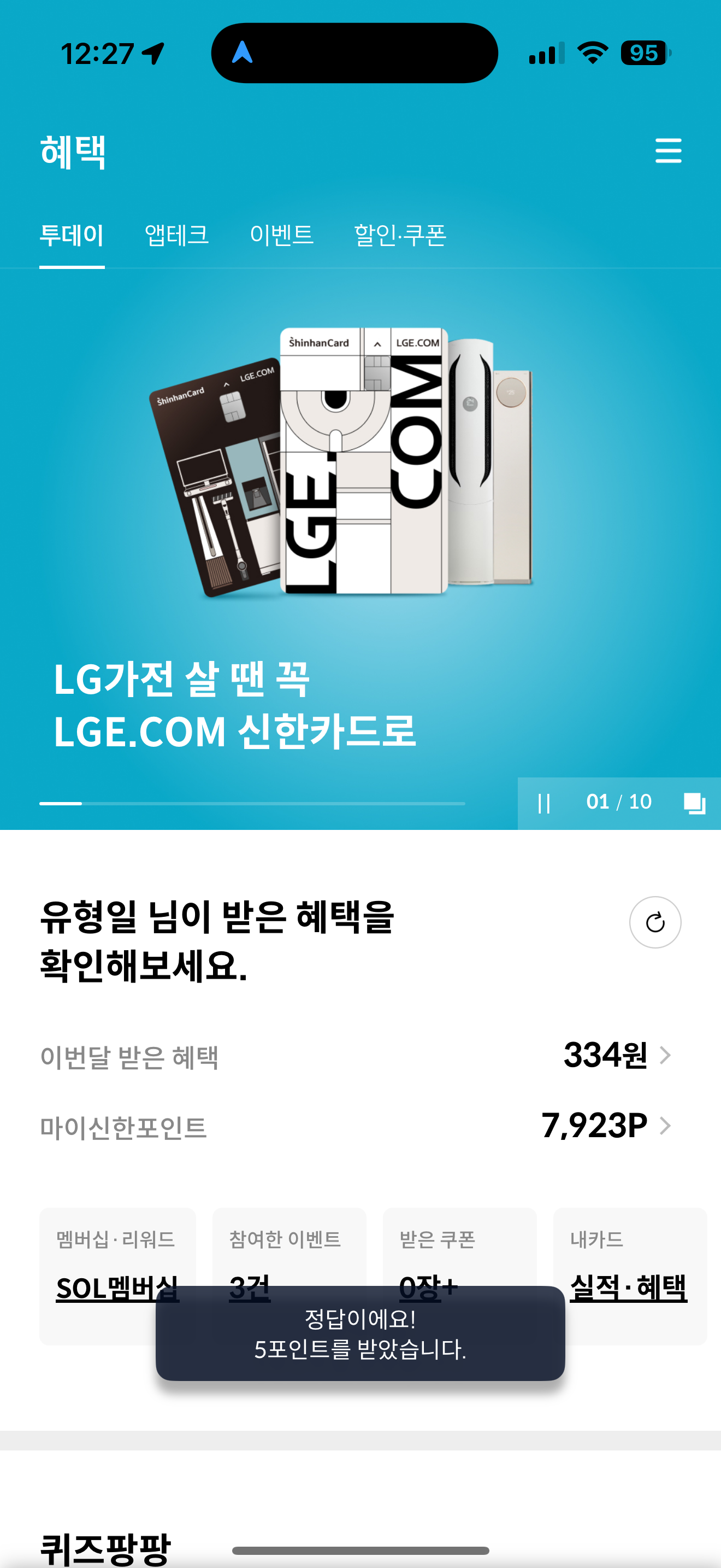 신한카드 퀴즈팡팡 5월 10일 문제입니다