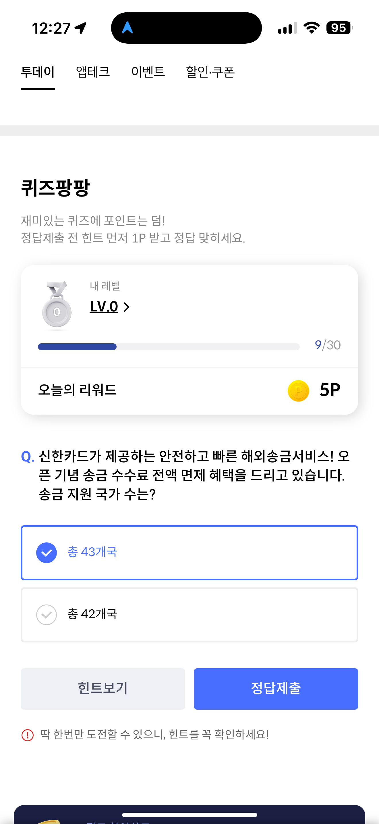 신한카드 퀴즈팡팡 정답은 총 43개국 입니다
