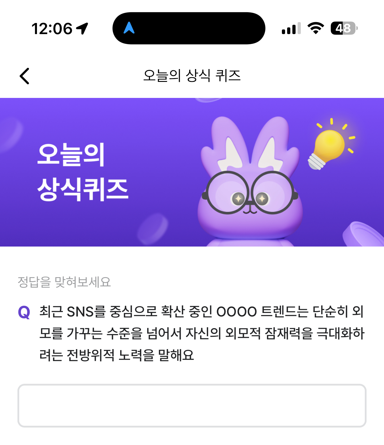 최근 SNS를 중심으로 확산 중인 OOOO 트렌드는 단순히 외모를 가꾸는 수준을 넘어서 자신의 외모적 잠재력을 극대화하려는 전방위적 노력을 말해요 주관식 퀴즈인데요. SNS를 중심으로 확산이 되는 트랜드로 여전히 많은 분들이 생소한 내용이 아닐까 합니다.