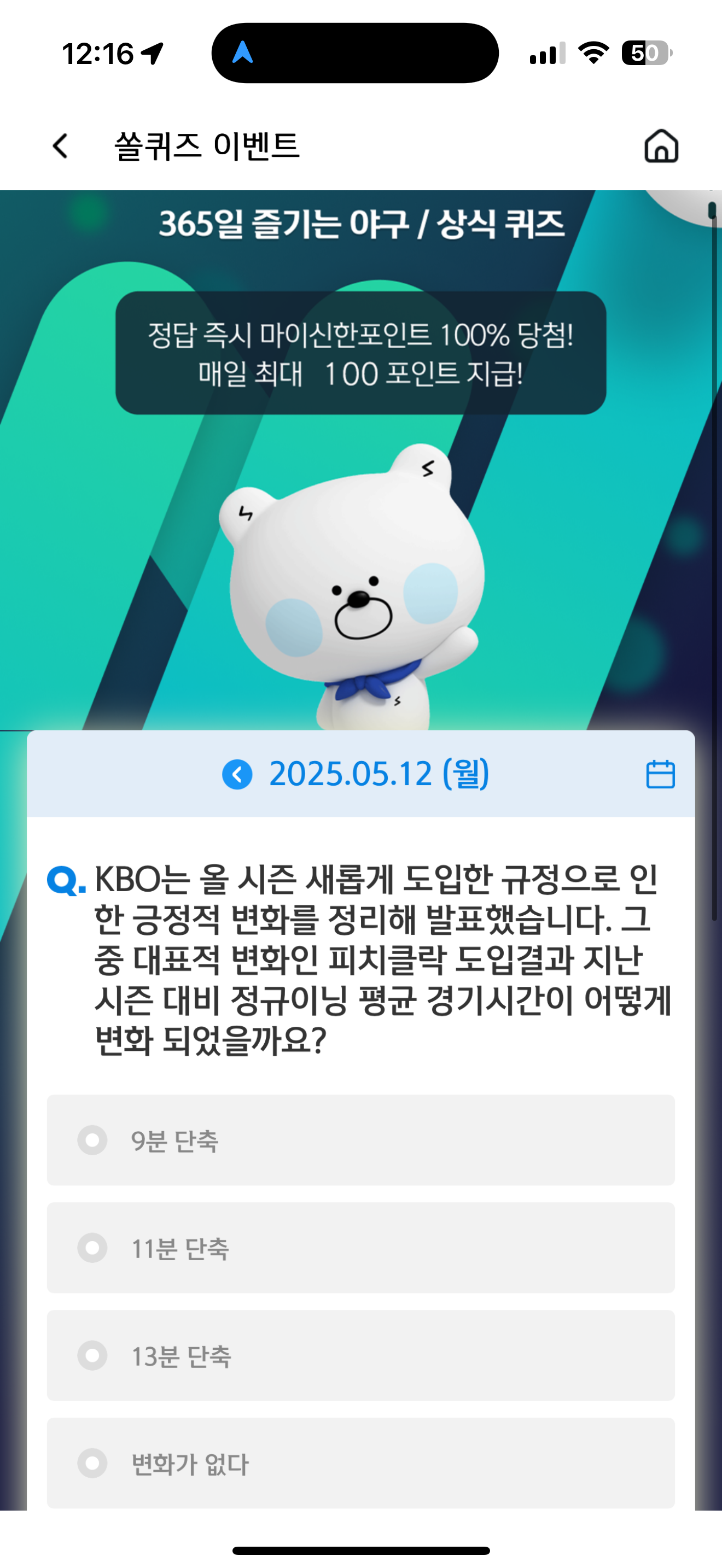 신한 슈퍼SOL 야구/상식 쏠퀴즈 5월 12일 문제입니다