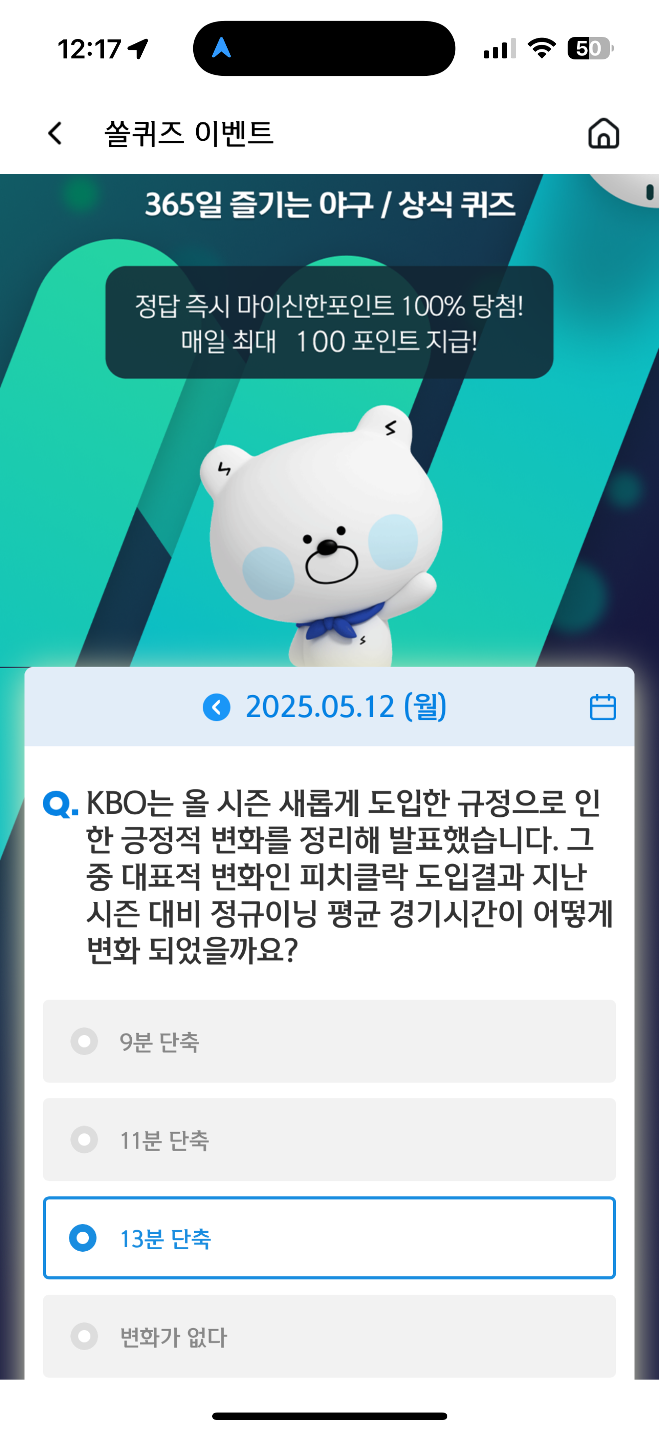 신한 슈퍼SOL 야구/상식 쏠퀴즈 정답은 13분 단축 입니다