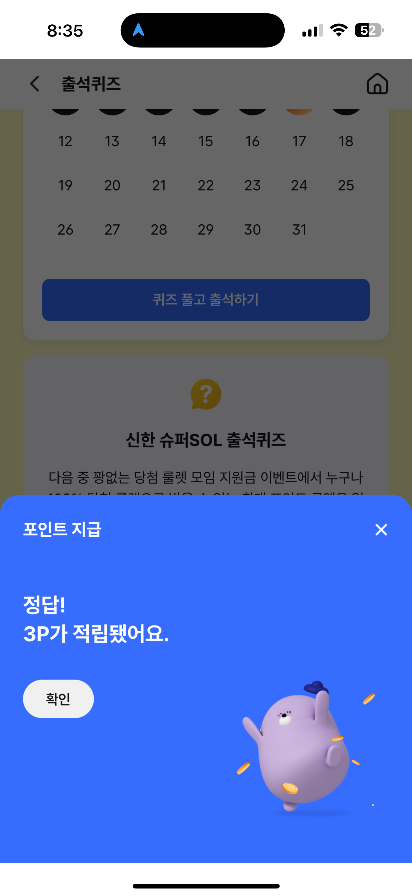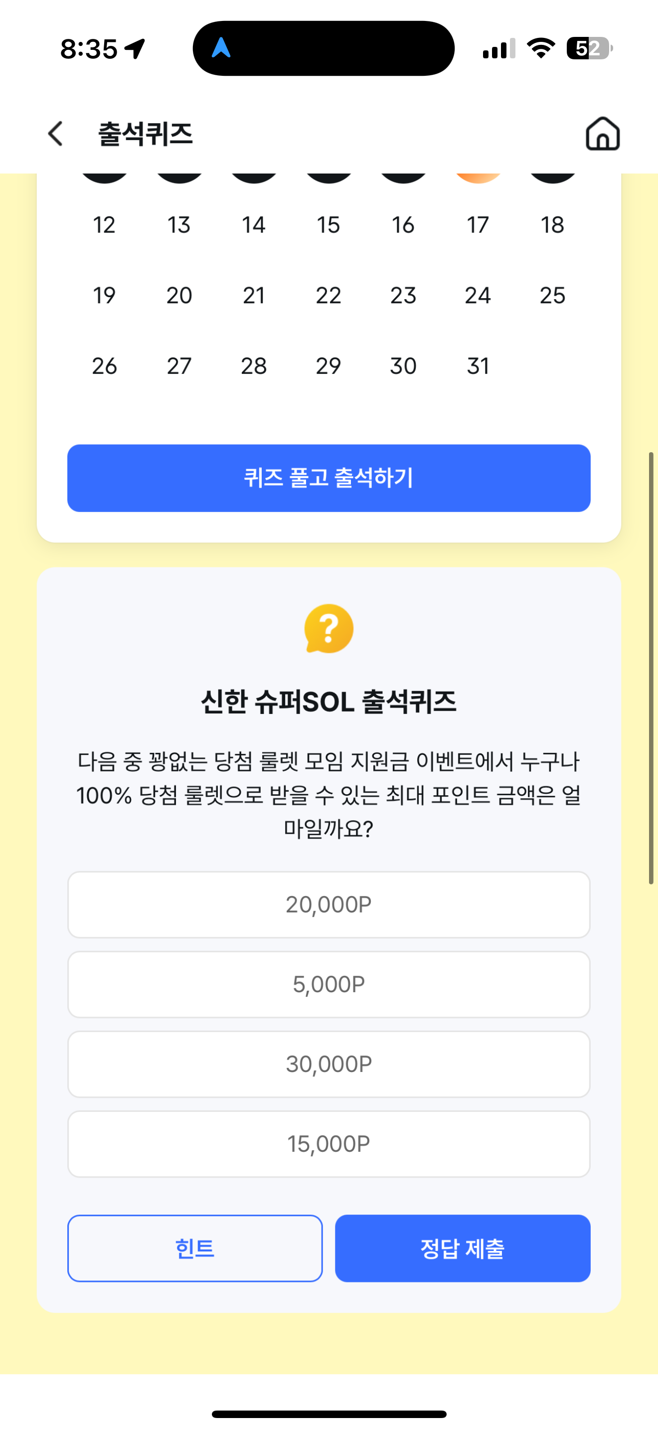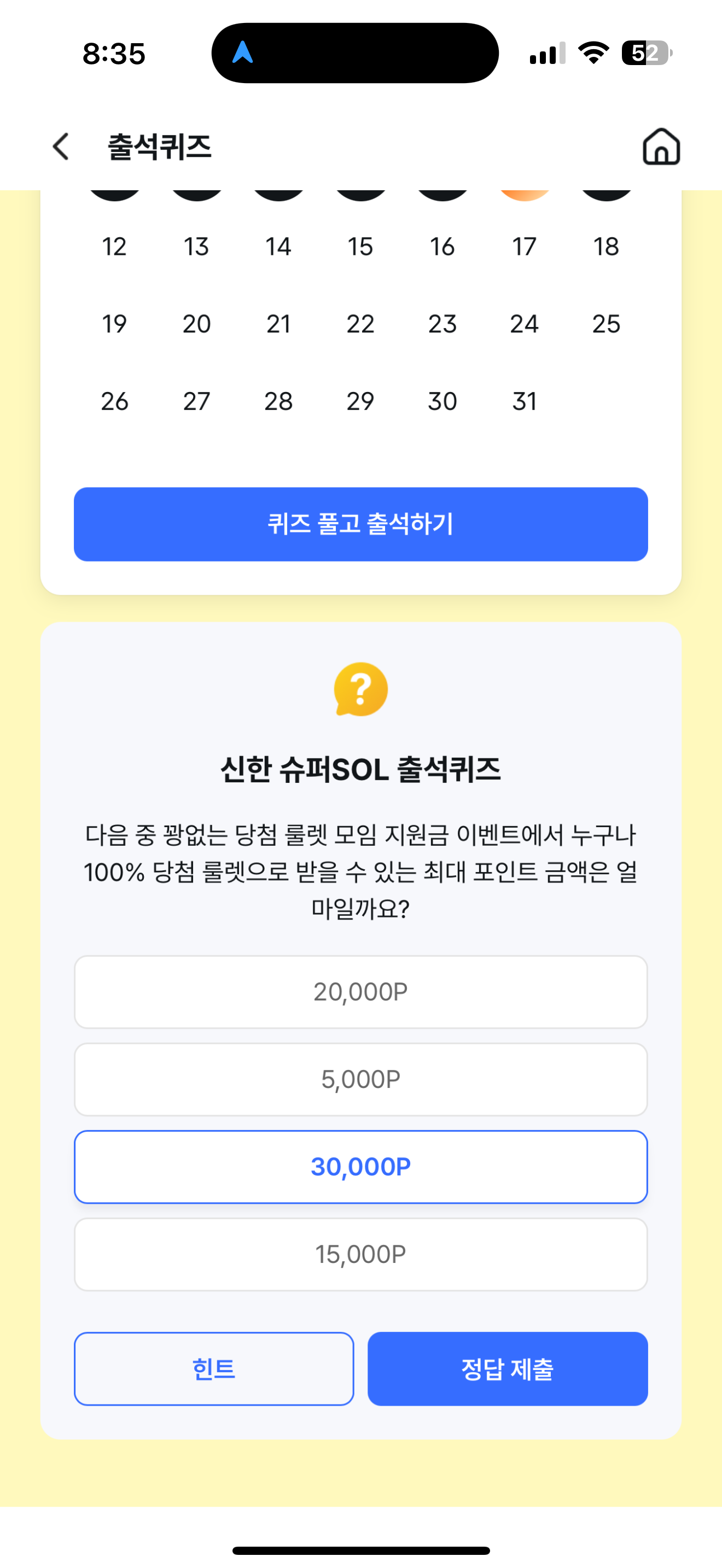 신한 슈퍼SOL 출석퀴즈 정답은 30,000P 입니다