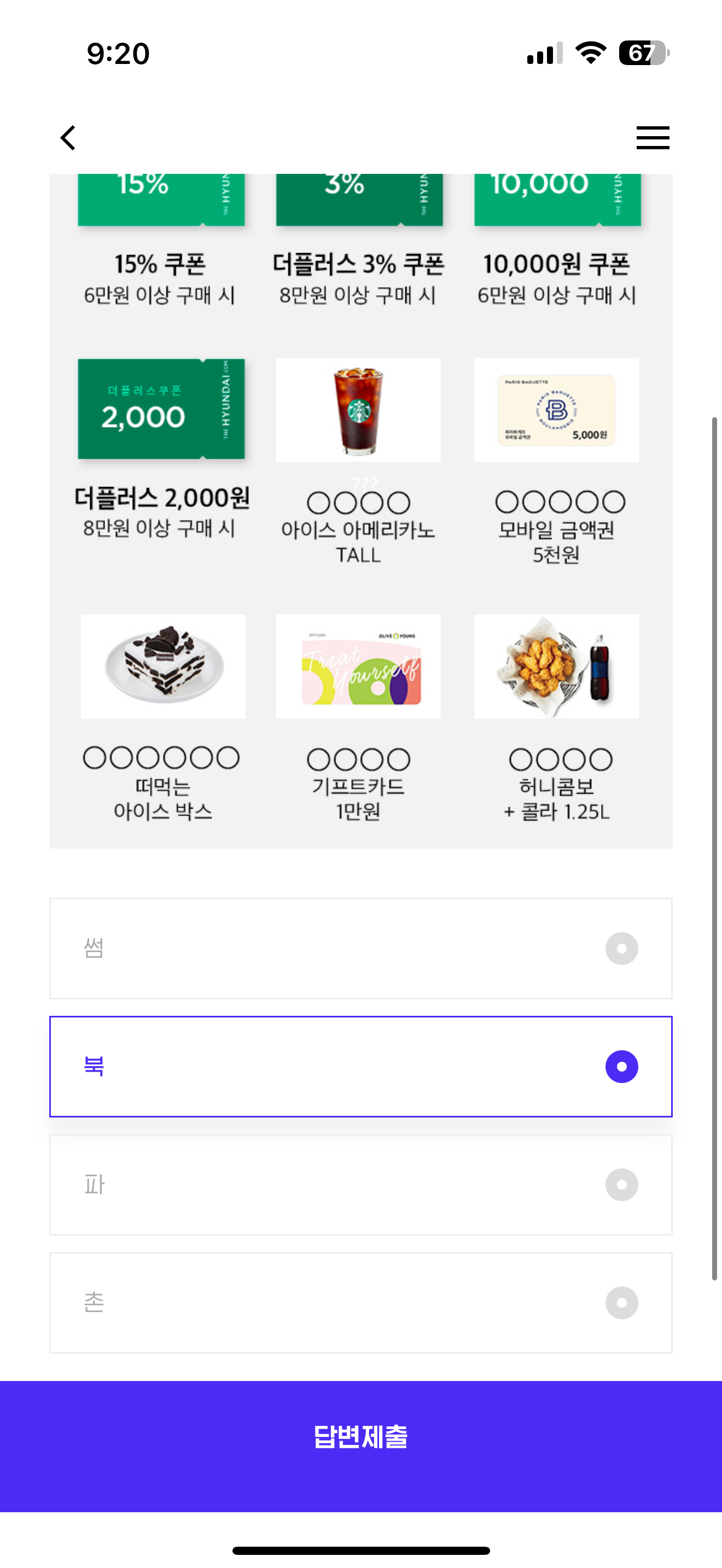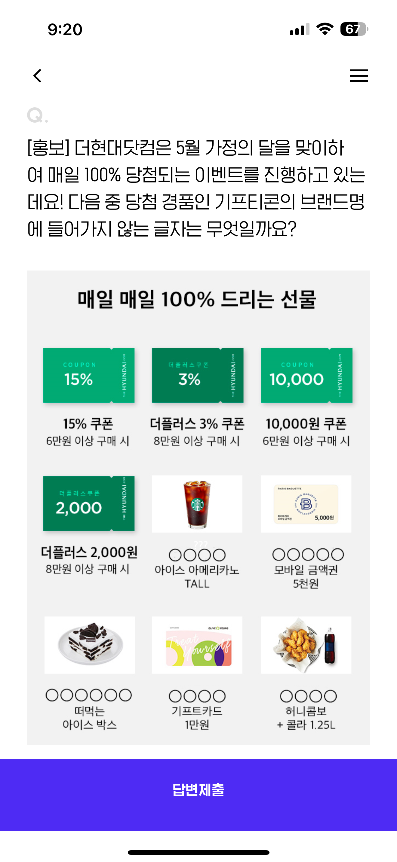 더현대닷컴은 5월 가정의 달을 맞이하여 매일 100% 당첨되는 이벤트를 진행하고 있는데요! 다음 중 당첨 경품인 기프티콘의 브랜드명에 들어가지 않는 글자는 무엇일까요? 보기는 1. 썸 2. 북 3. 파 4. 촌 입니다.
