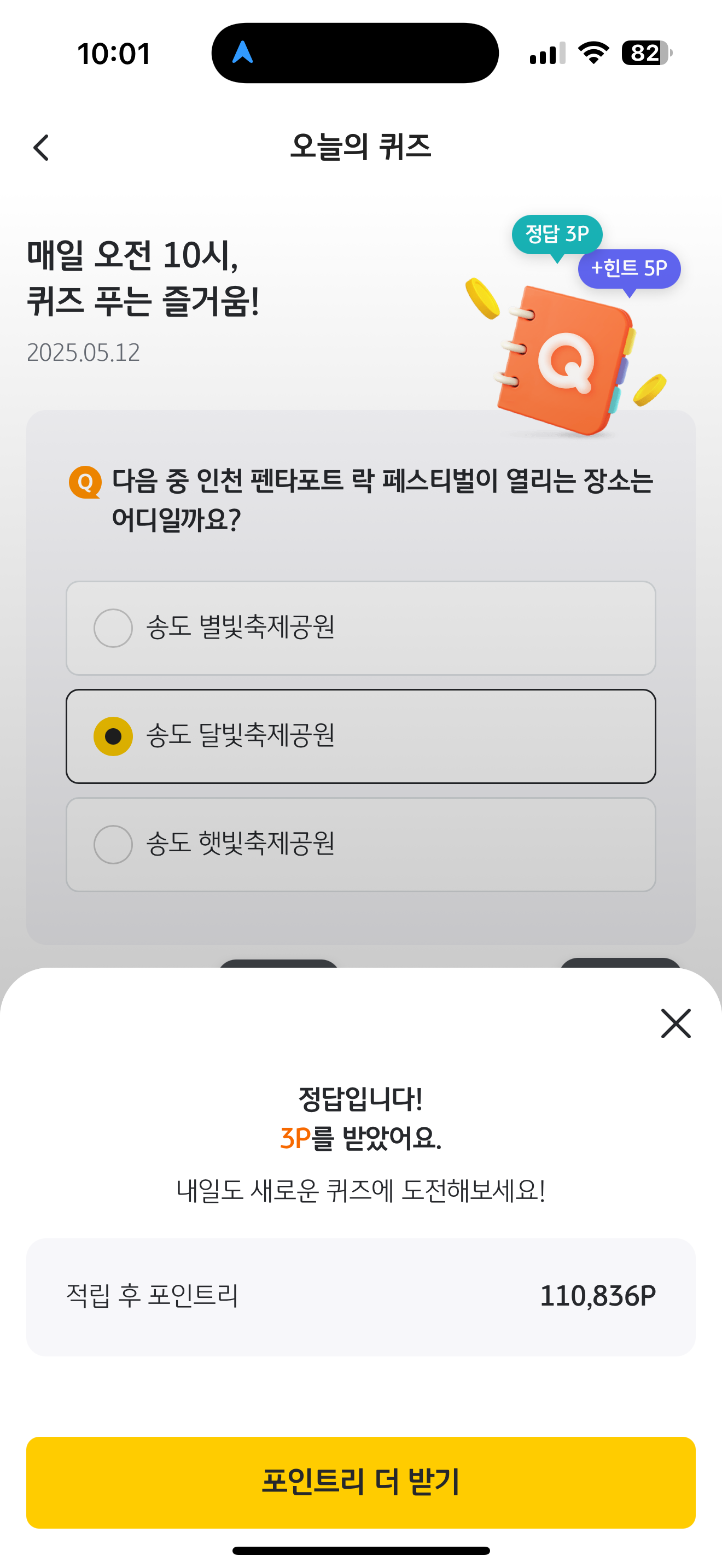 다음 중 인천 펜타포트 락 페스티벌이 열리는 장소는 어디일까요? 보기는 1. 송도 별빛축제공원 2. 송도 달빛축제공원 3. 송도 햇빛축제공원 입니다. 인천의 대표적인 축제인 펜타포트 락 페스티벌이 열립니다. 참고해서 좋은 시간 보내세요