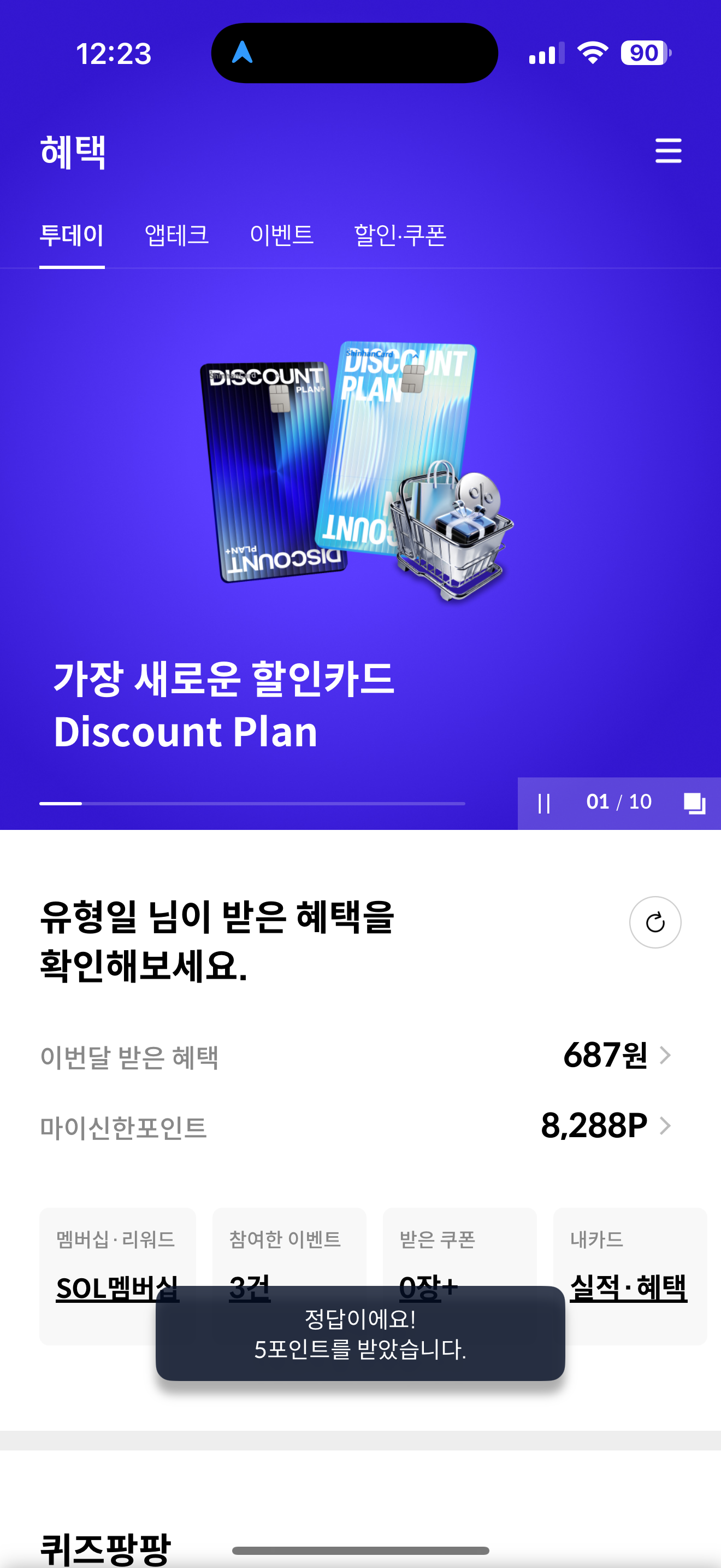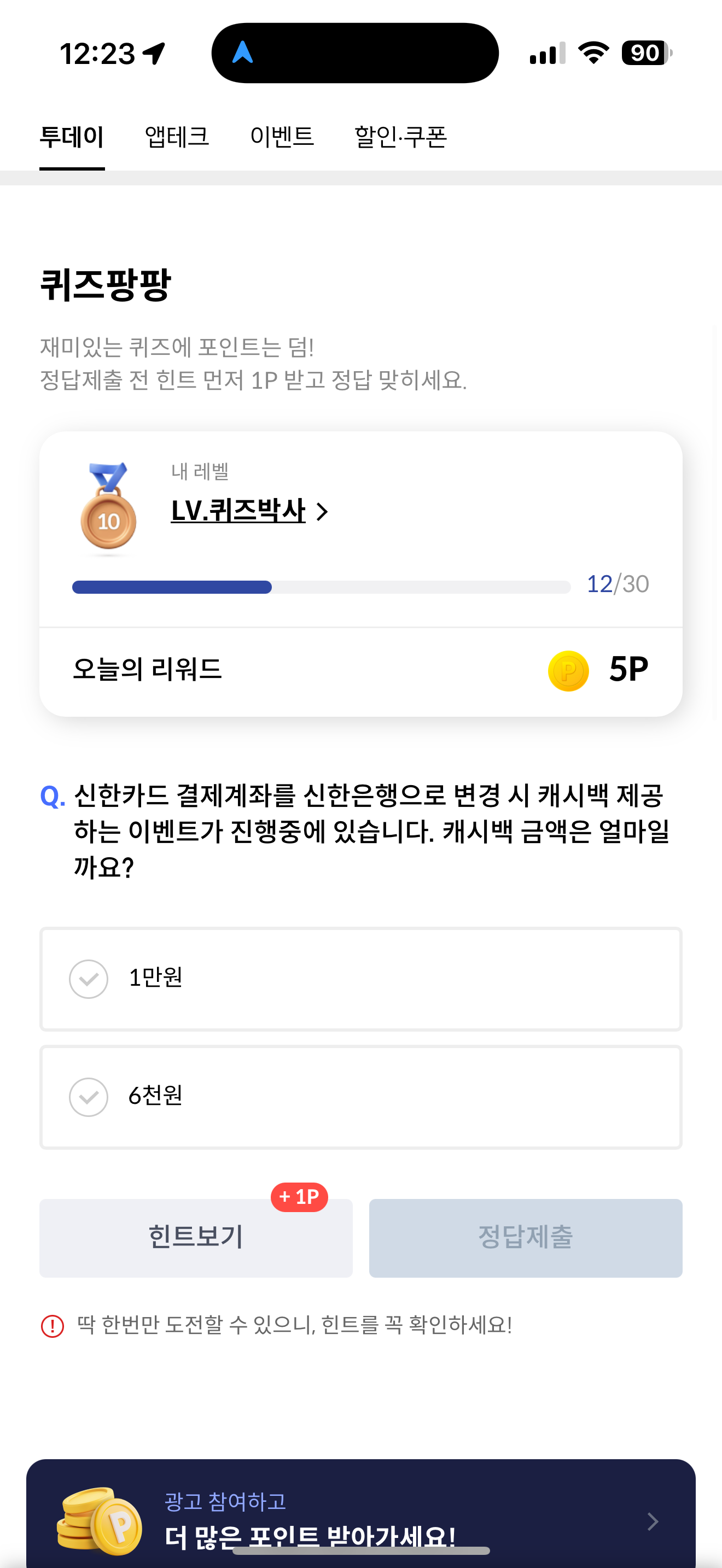 신한카드 퀴즈팡팡 정답은 1만원 입니다
