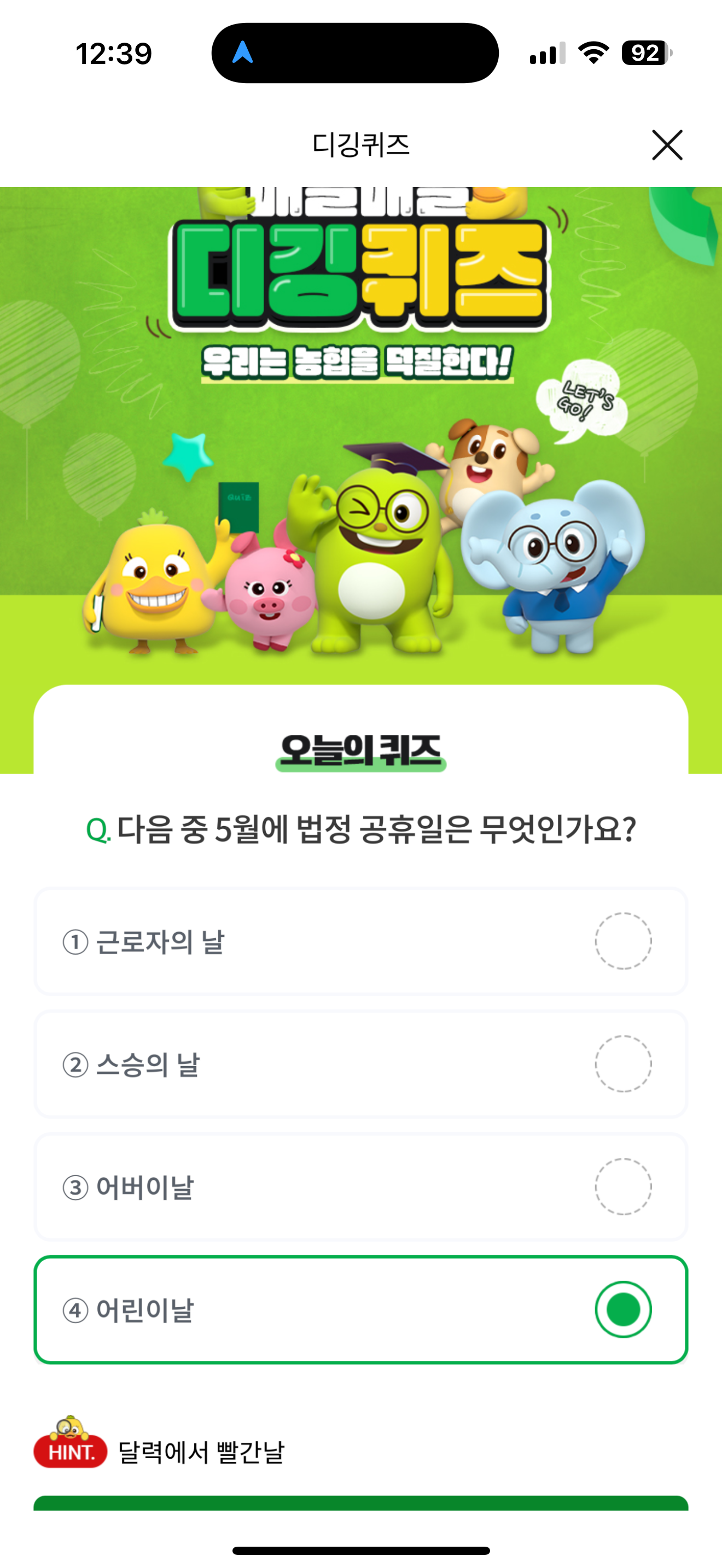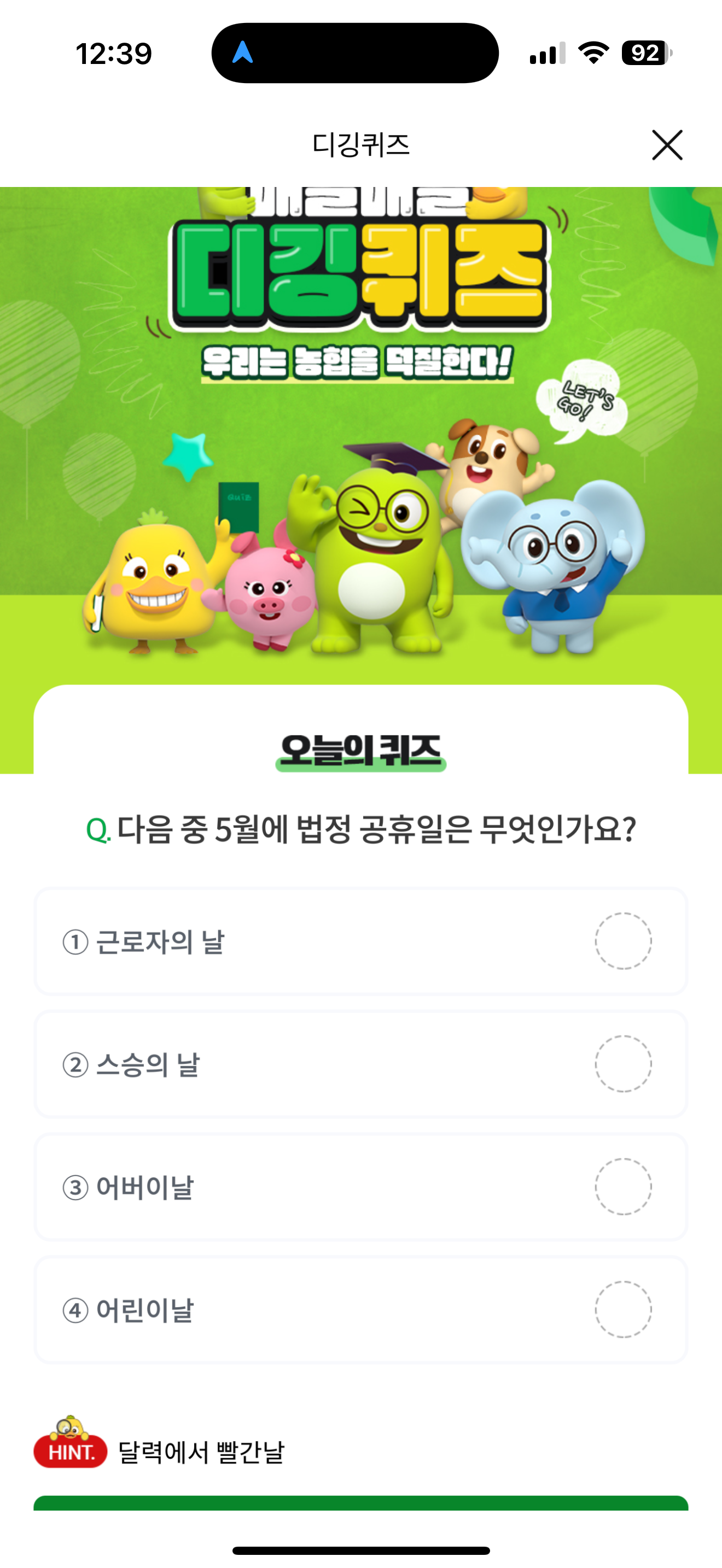 NH올원뱅크 디깅퀴즈 정답은 어린이날 입니다