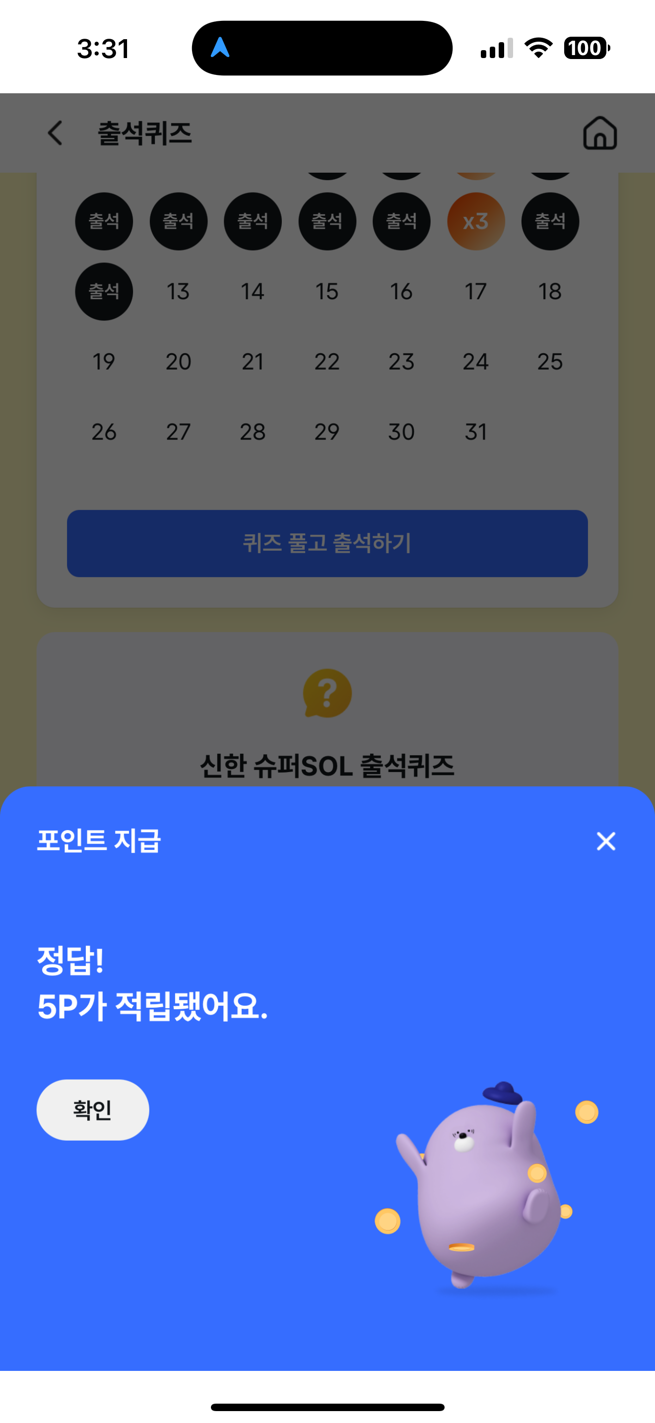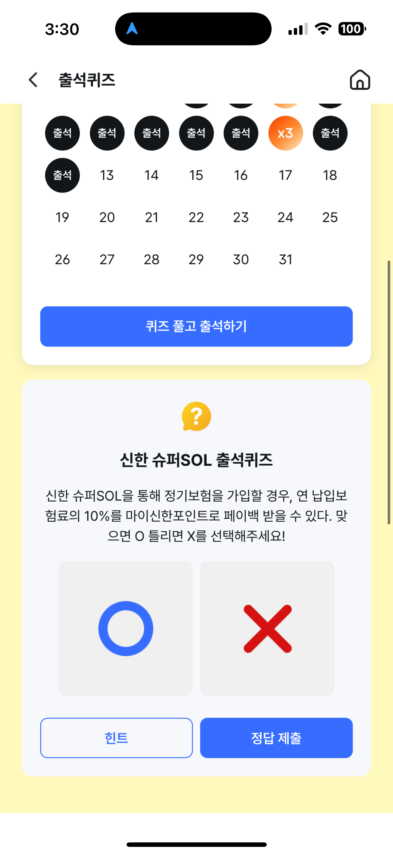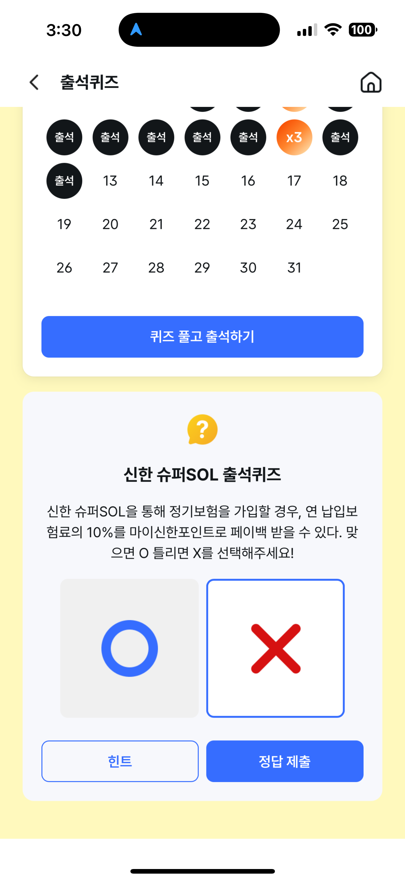 신한 슈퍼SOL 출석퀴즈 정답은 X 입니다