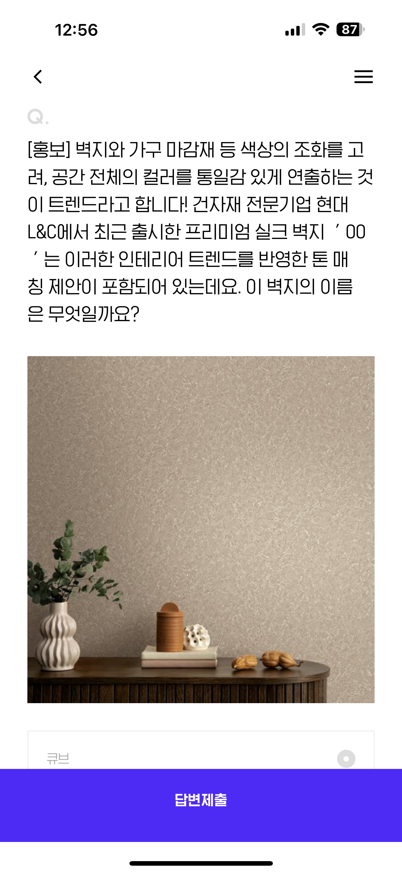 벽지와 가구 마감재 등 색상의 조화를 고려, 공간 전체의 컬러를 통일감 있게 연출하는 것이 트렌드라고 합니다! 건자재 전문기업 현대 L&C에서 최근 출시한 프리미엄 실크 벽지 ' OO ' 는 이러한 인테리어 트렌드를 반영한 톤 매칭 제안이 포함되어 있는데요. 이 벽지의 이름은 무엇일까요? 보기는 1. 큐브 2. 큐알 3. 큐피트 4. 큐빅 입니다.