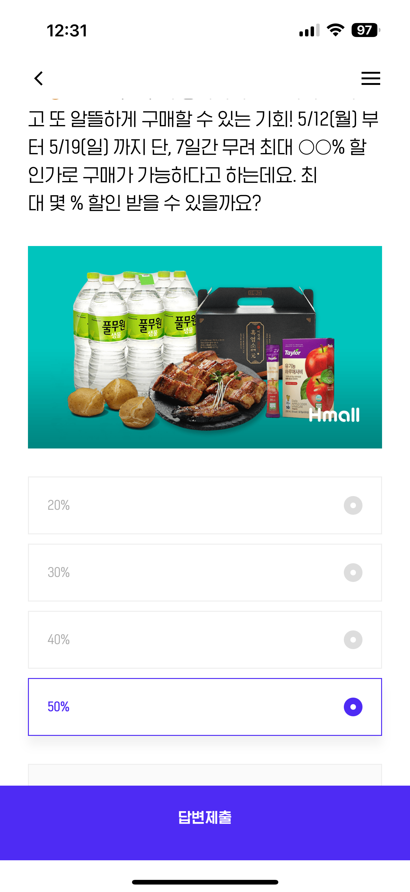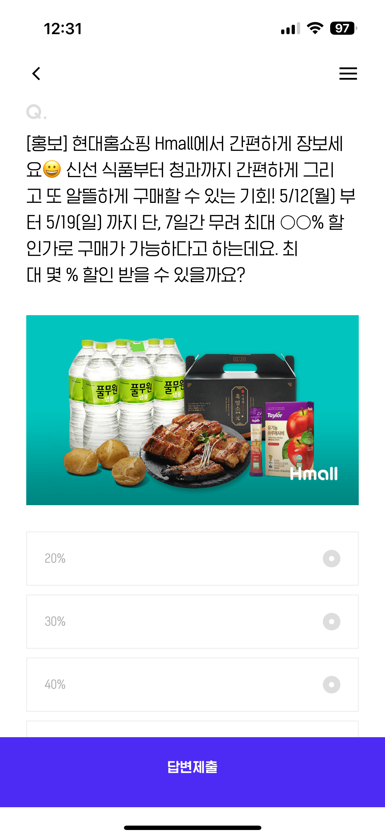 현대홈쇼핑 Hmall에서 간편하게 장보세요 신선 식품부터 청과까지 간편하게 그리고 또 알뜰하게 구매할 수 있는 기회! 5/12(월) 부터 5/19(일) 까지 단, 7일간 무려 최대 OO% 할인가로 구매가 가능하다고 하는데요. 최대 몇 % 할인 받을 수 있을까요? 보기는 1. 20% 2. 30% 3. 40% 4. 50% 입니다