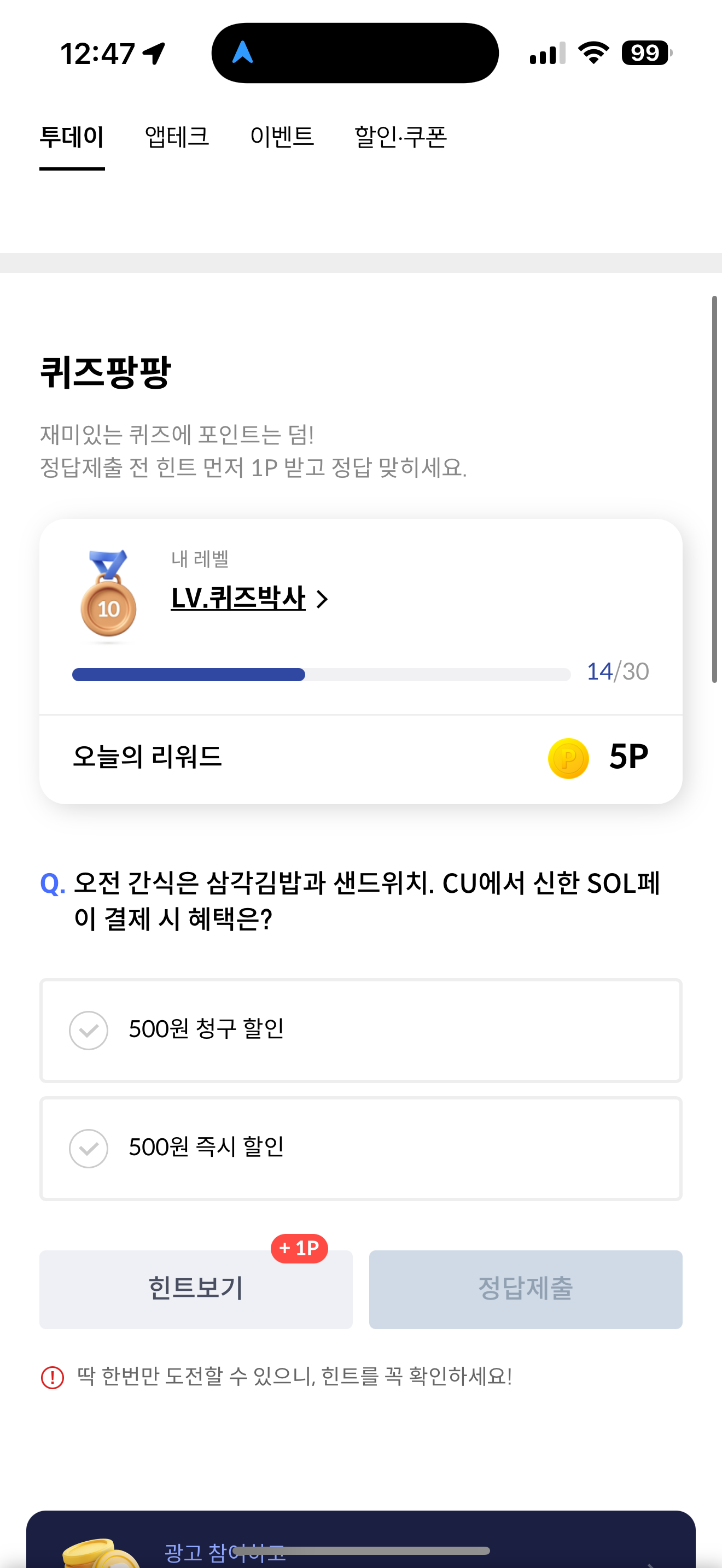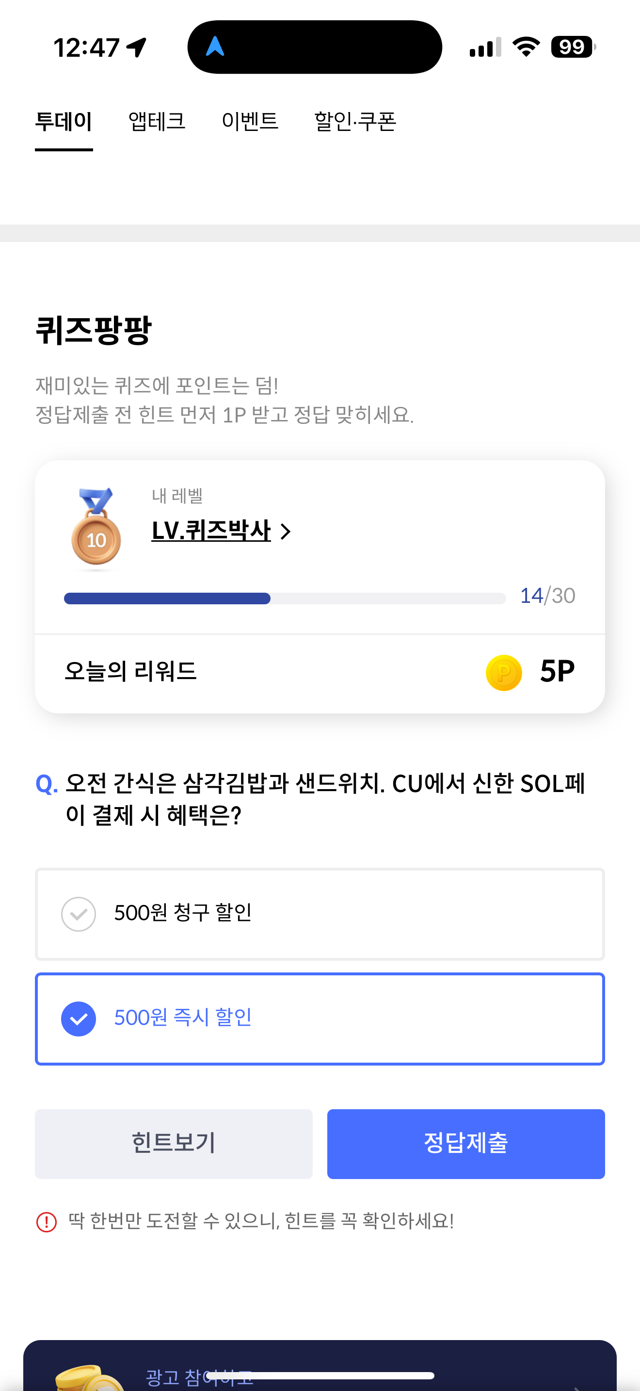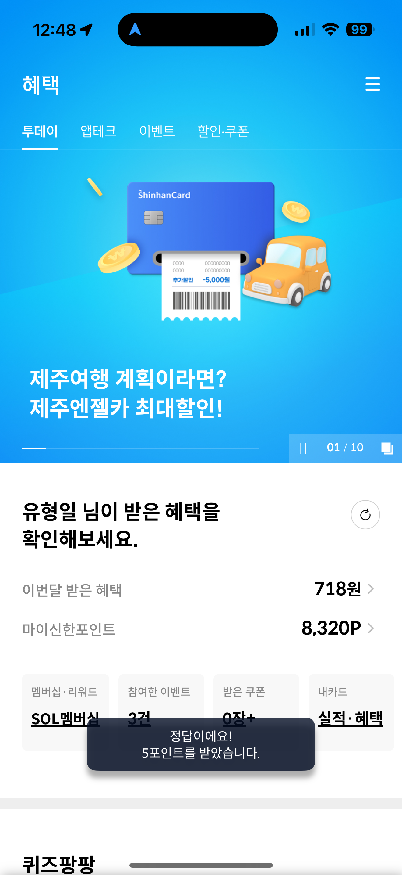신한카드 퀴즈팡팡 정답은 500원 즉시 할인 입니다
