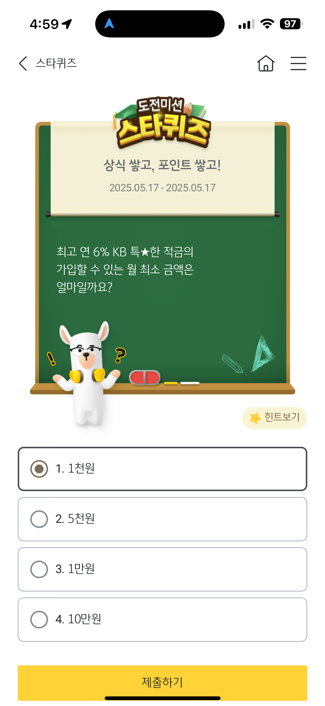 KB스타뱅킹 스타퀴즈 정답은 1천원 입니다