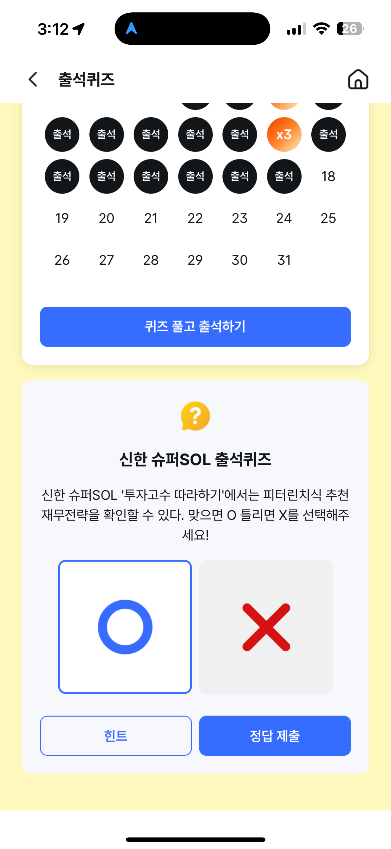 신한 슈퍼SOL 출석퀴즈 정답은 O 입니다