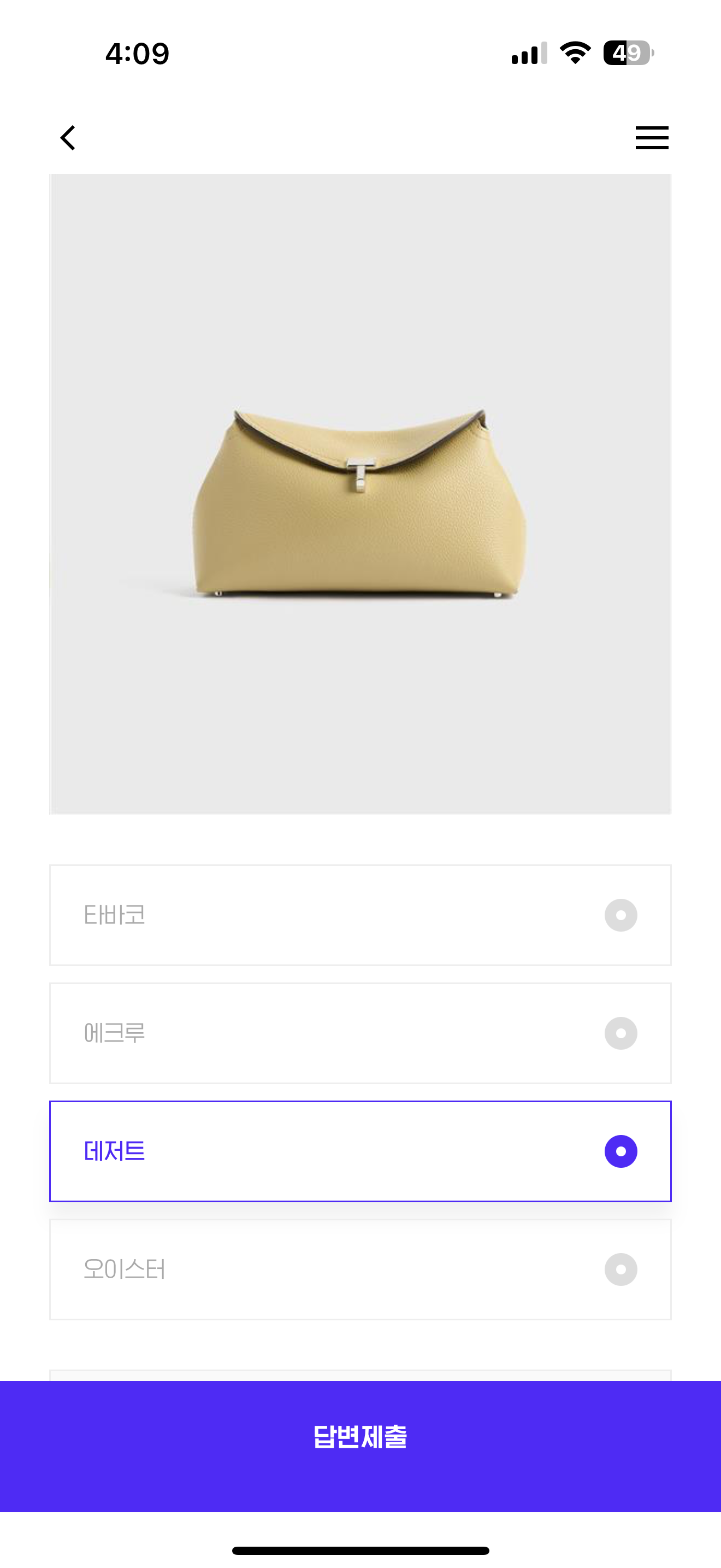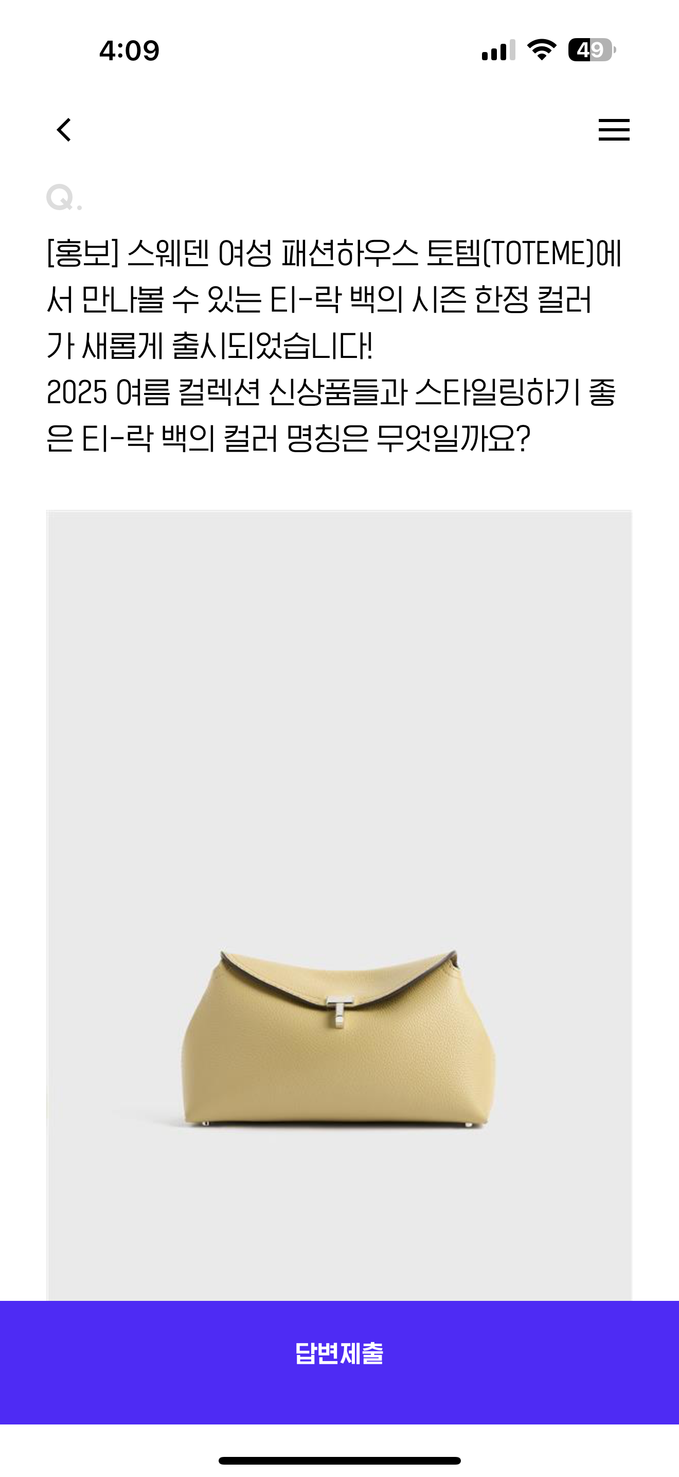 스웨덴 여성 패션하우스 토템(TOTEME)에서 만나볼 수 있는 티-락 백의 시즌 한정 컬러가 새롭게 출시되었습니다! 2025 여름 컬렉션 신상품들과 스타일링하기 좋은 티-락 백의 컬러 명칭은 무엇일까요? 보기는 1. 타바코 2. 에크루 3. 데저트 4. 오이스터 입니다