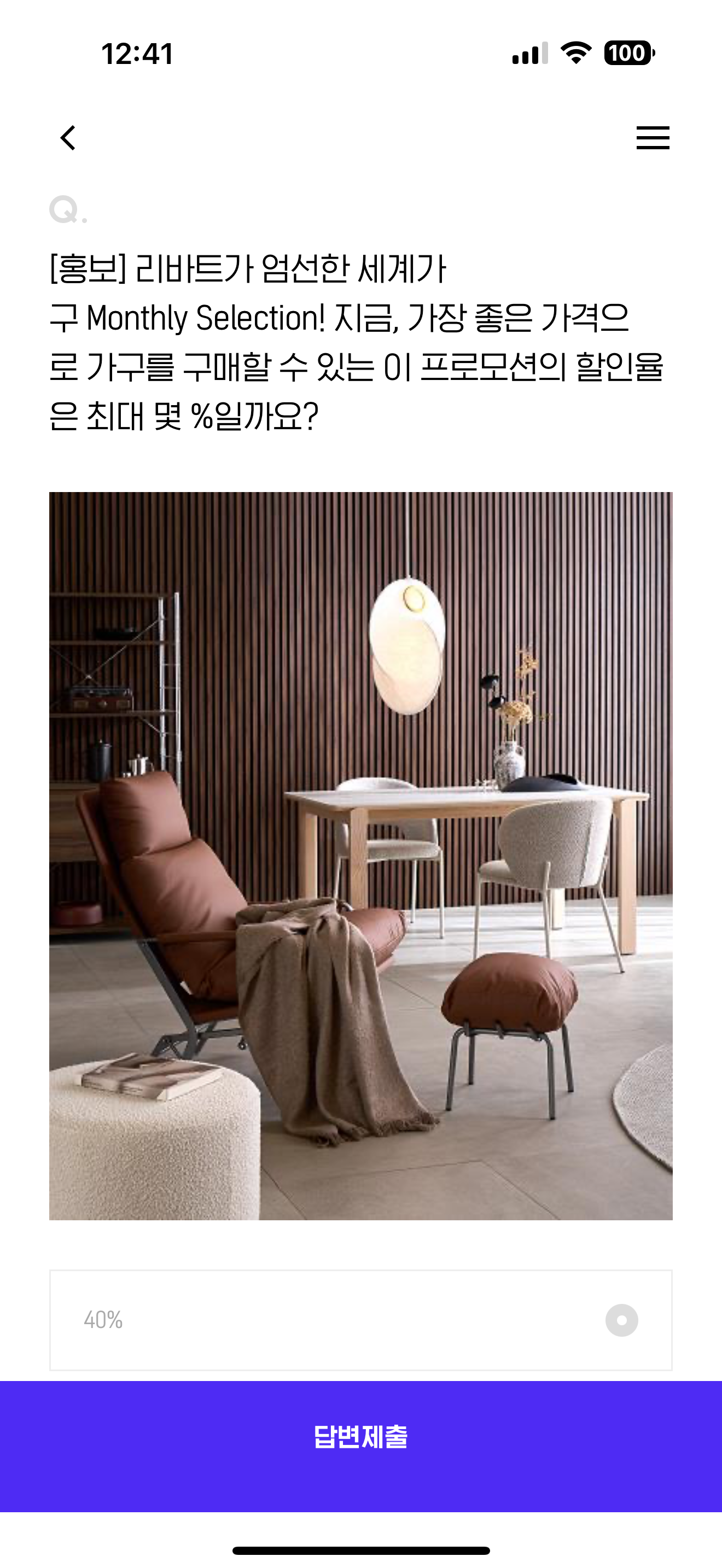 리바트가 엄선한 세계가구 Monthly Selection! 지금, 가장 좋은 가격으로 가구를 구매할 수 있는 이 프로모션의 할인율은 최대 몇 %일가요? 보기는 1. 40% 2. 50% 3. 60% 4. 70% 입니다. 리바트가 엄선한 셰계가구는 무엇이 다른지 확인해 보세요