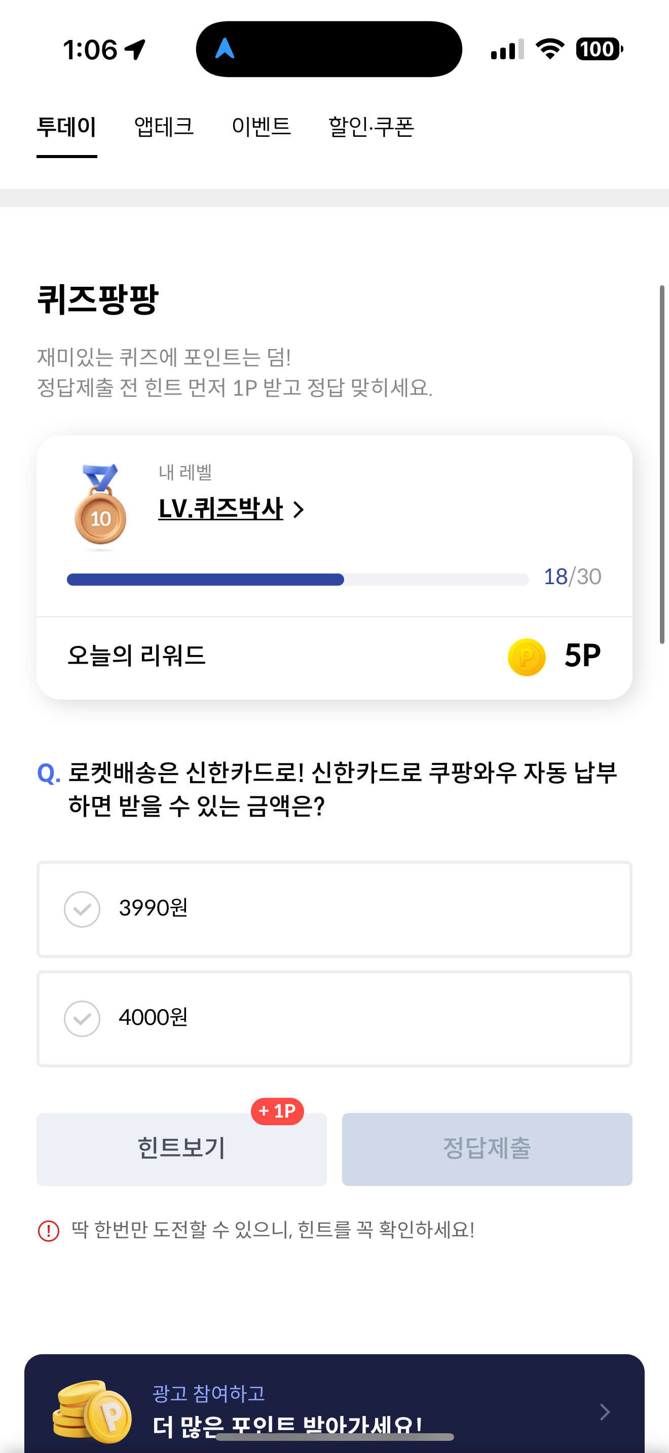 신한카드 퀴즈팡팡 정답은 4000원 입니다