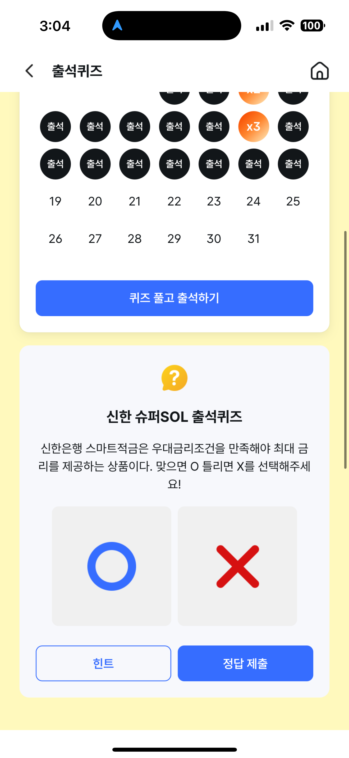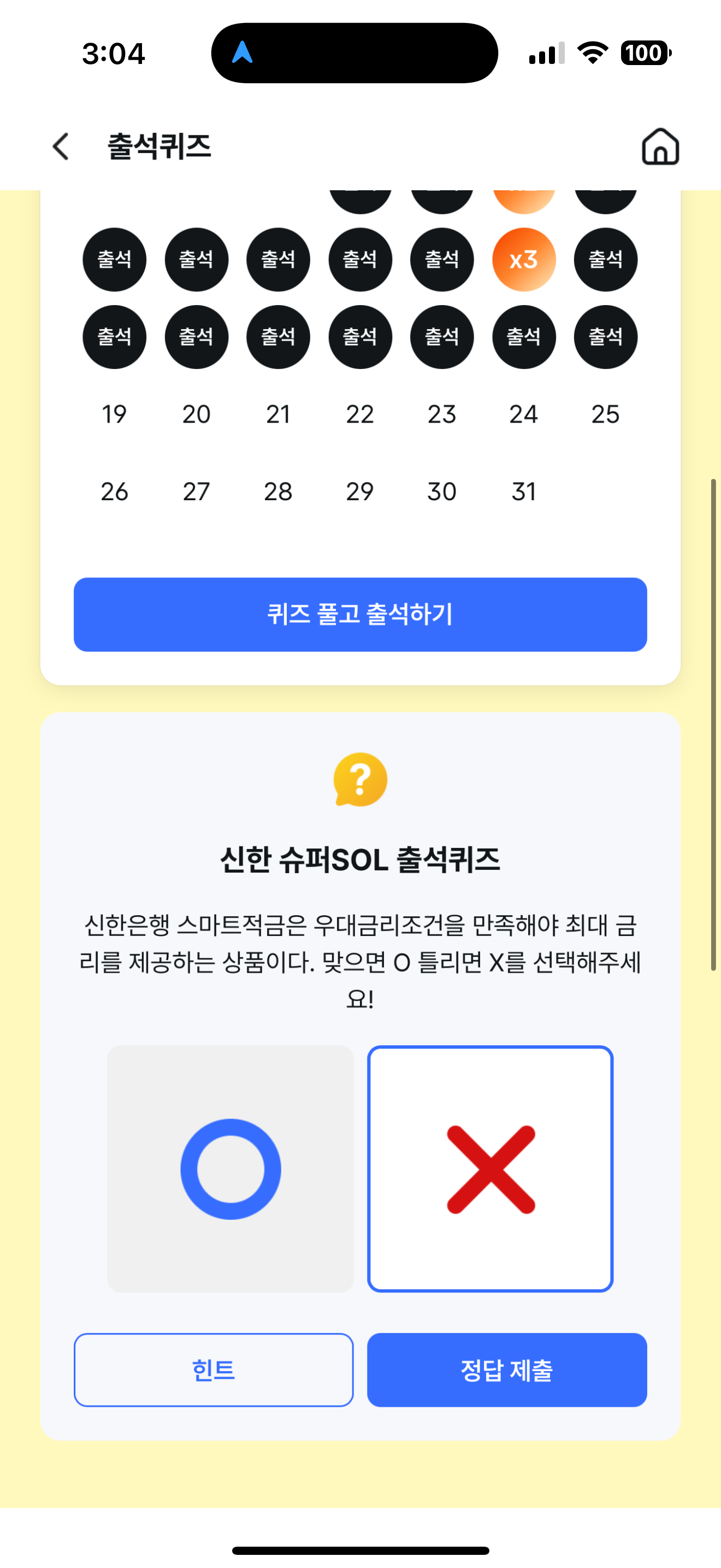 신한 슈퍼SOL 출석퀴즈 정답은 X 입니다