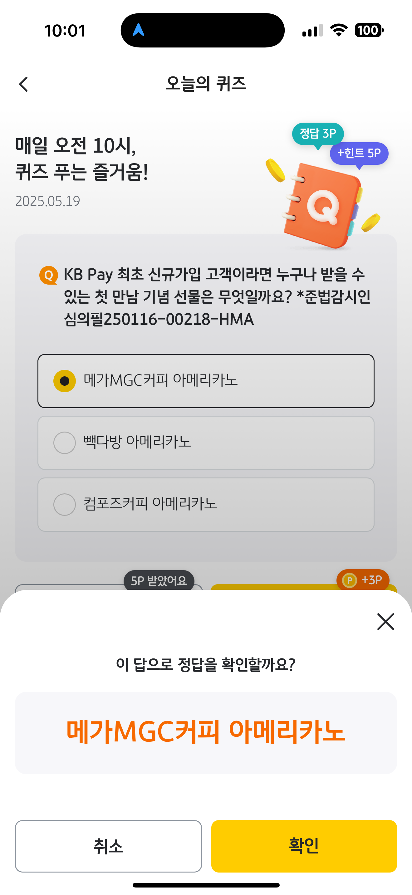 KB Pay 오늘의 퀴즈 정답은 메가MGC커피 아메리카노 입니다