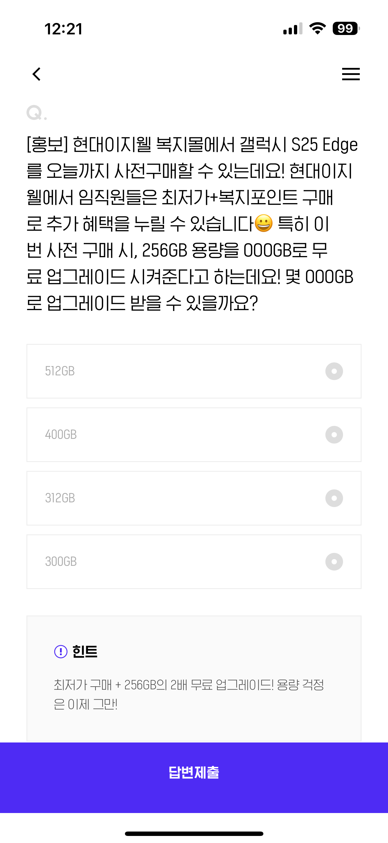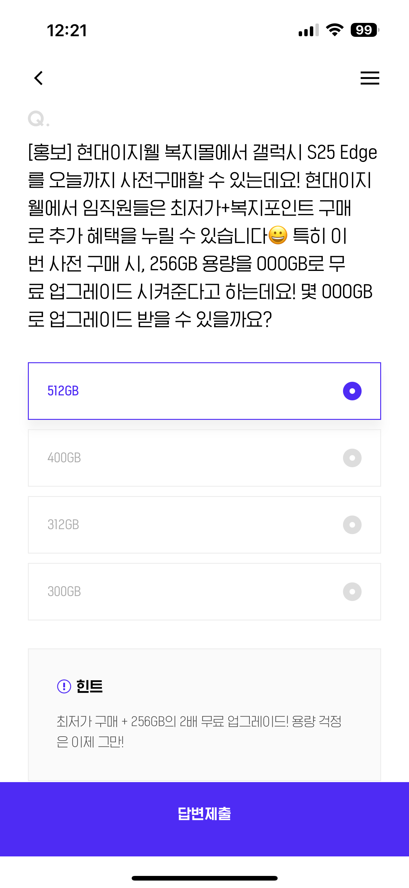 현대이지웰 복지몰에서 갤럭시 S25 Edge를 오늘까지 사전구매할 수 있는데요! 현대이지웰에서 임직원들은 최저가+복지포인트 구매로 추가 혜택을 누릴 수 있습니다 특히 이번 사전 구매 시, 256GB 용량을 000GB로 무료 업그레이드 시켜준다고 하는데요! 몇 000GB로 업그레이드 받을 수 있을까요? 보기는 1. 512GB 2. 400GB 3. 312GB 4. 300GB