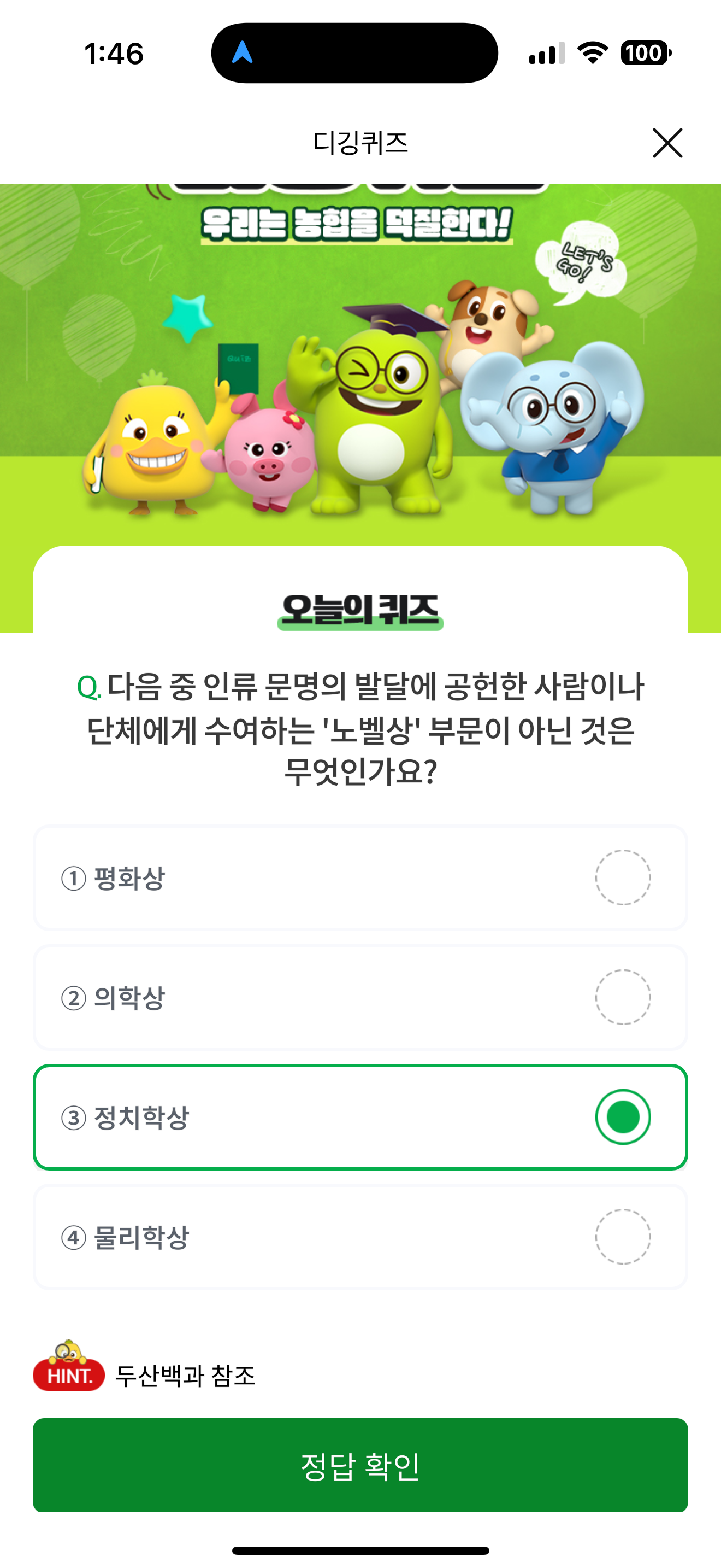 NH올원뱅크 디깅퀴즈 정답은 정치학상 입니다