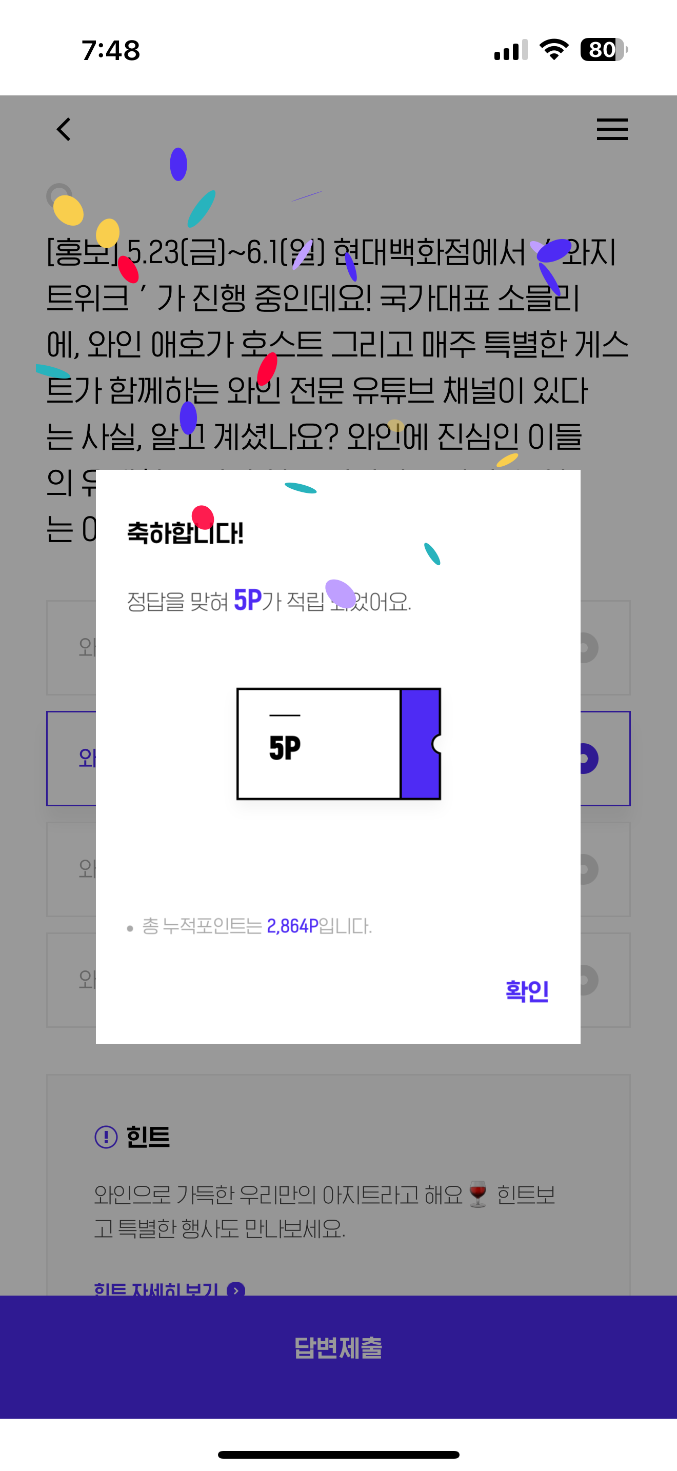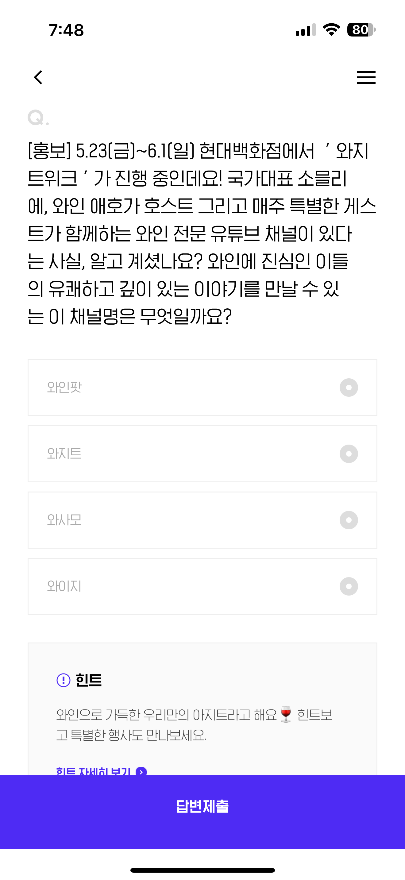 5.23(금)~6.1(일) 현대백화점에서 ' 와지트위크 ' 가 진행 중인데요! 국가대표 소믈리에, 와인 애호가 호스트 그리고 매주 특별한 게스트가 함께하는 와인 전문 유튜브 채널이 있다는 사실, 알고 계셨나요? 와인에 진심인 이들의 유쾌하고 깊이 있는 이야기를 만날 수 있는 이 채널명은 무엇일까요? 보기는 1. 와인팟 2. 와지트 3. 와사모 4. 와이지 입니다