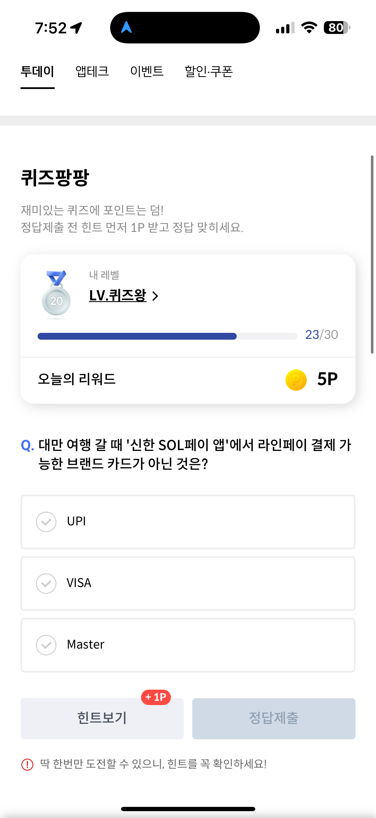 대만 여행 갈 때 '신한 SOL페이 앱'에서 라인페이 결제 가능한 브랜드 카드가 아닌 것은? 보기는 1. UPI 2. VISA 3. Master 입니다. 대한 여행시에 신한카드를 활용한 SOL 페이 앱으로 라인페이 결제 가능하다고 하니 잘 참고해서 활용해 보세요