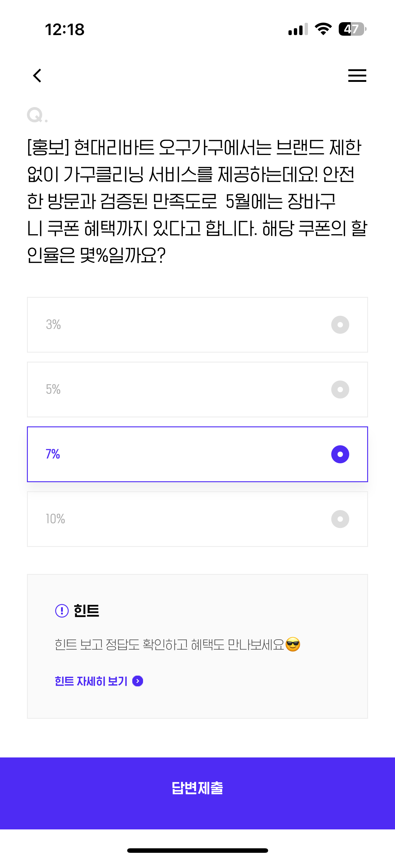 현대리바트 오구가구에서는 브랜드 제한없이 가구클리닝 서비스를 제공하는데요! 안전한 방문과 검증된 만족도로 5월에는 장바구니 쿠폰 혜택까지 있다고 합니다. 해당 쿠폰의 할인율은 몇%일까요? 보기는 1. 3% 2. 5% 3. 7% 4. 10% 입니다
